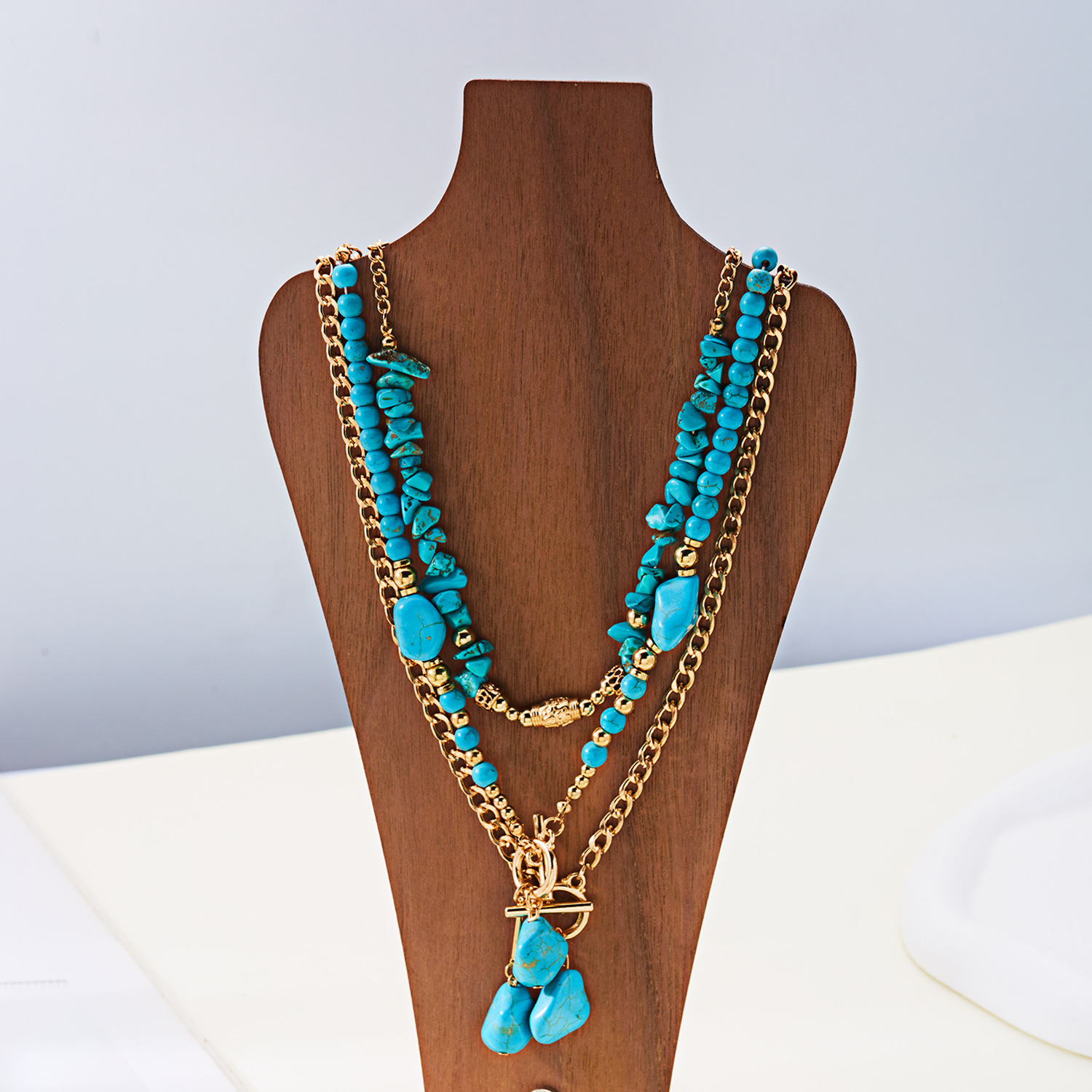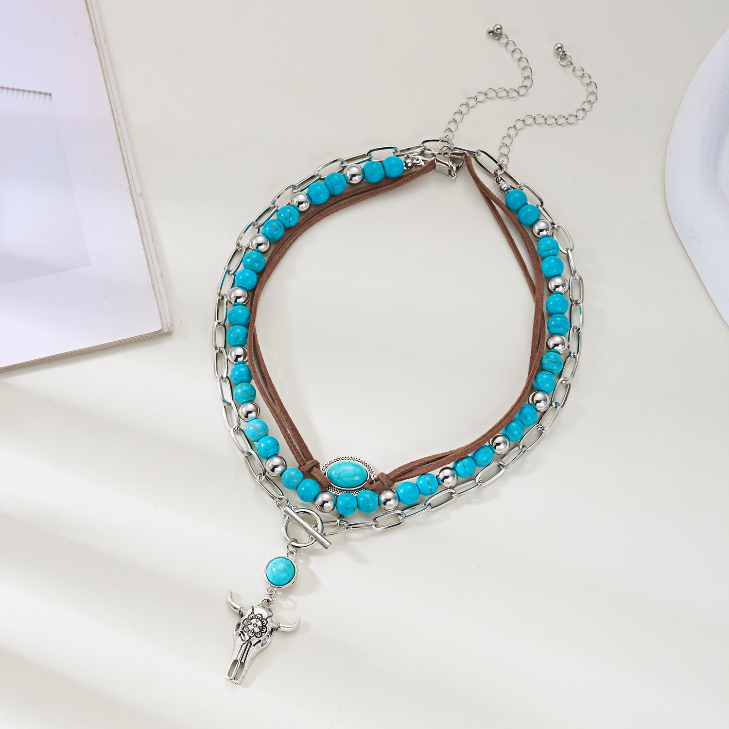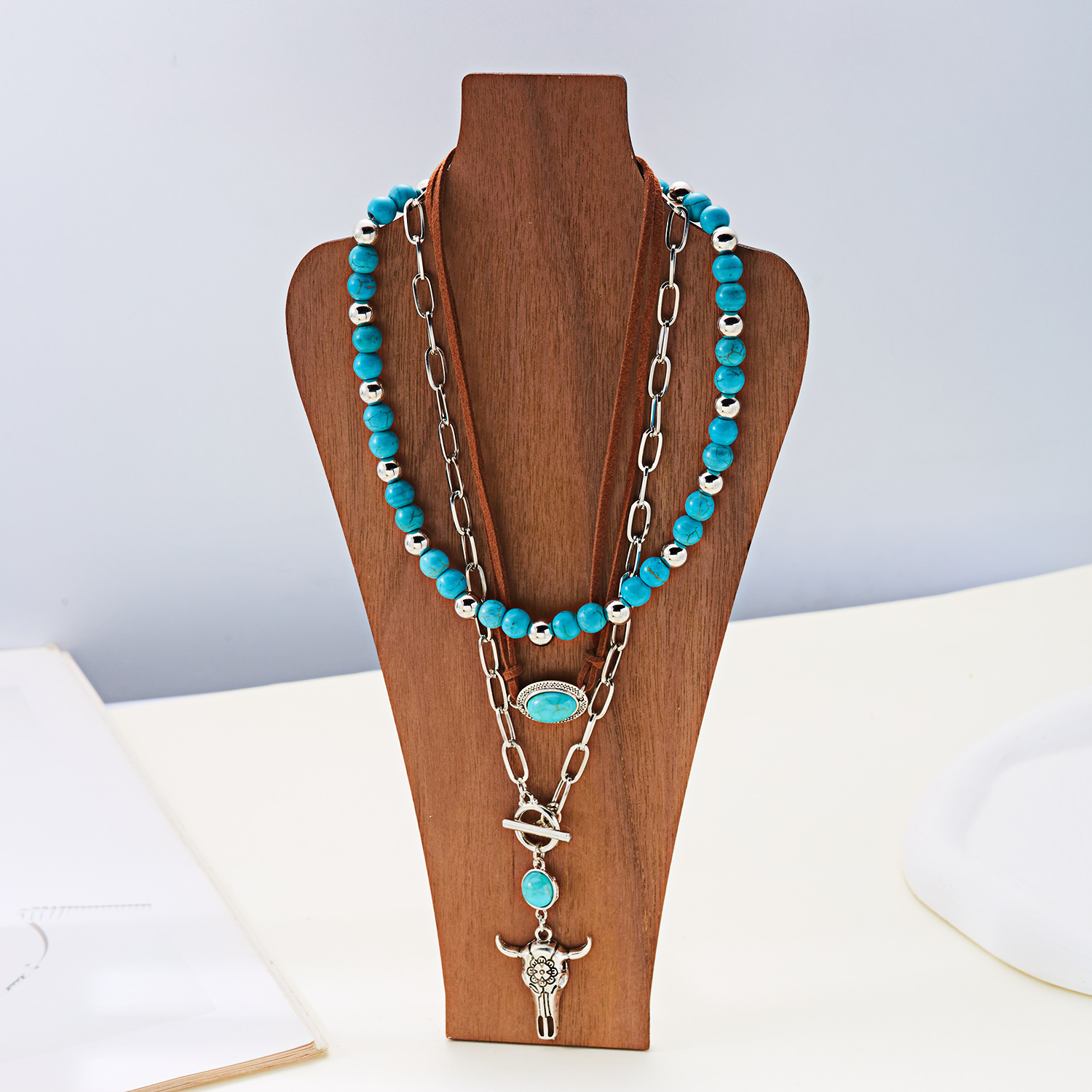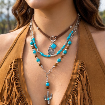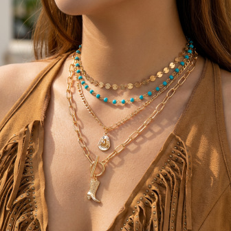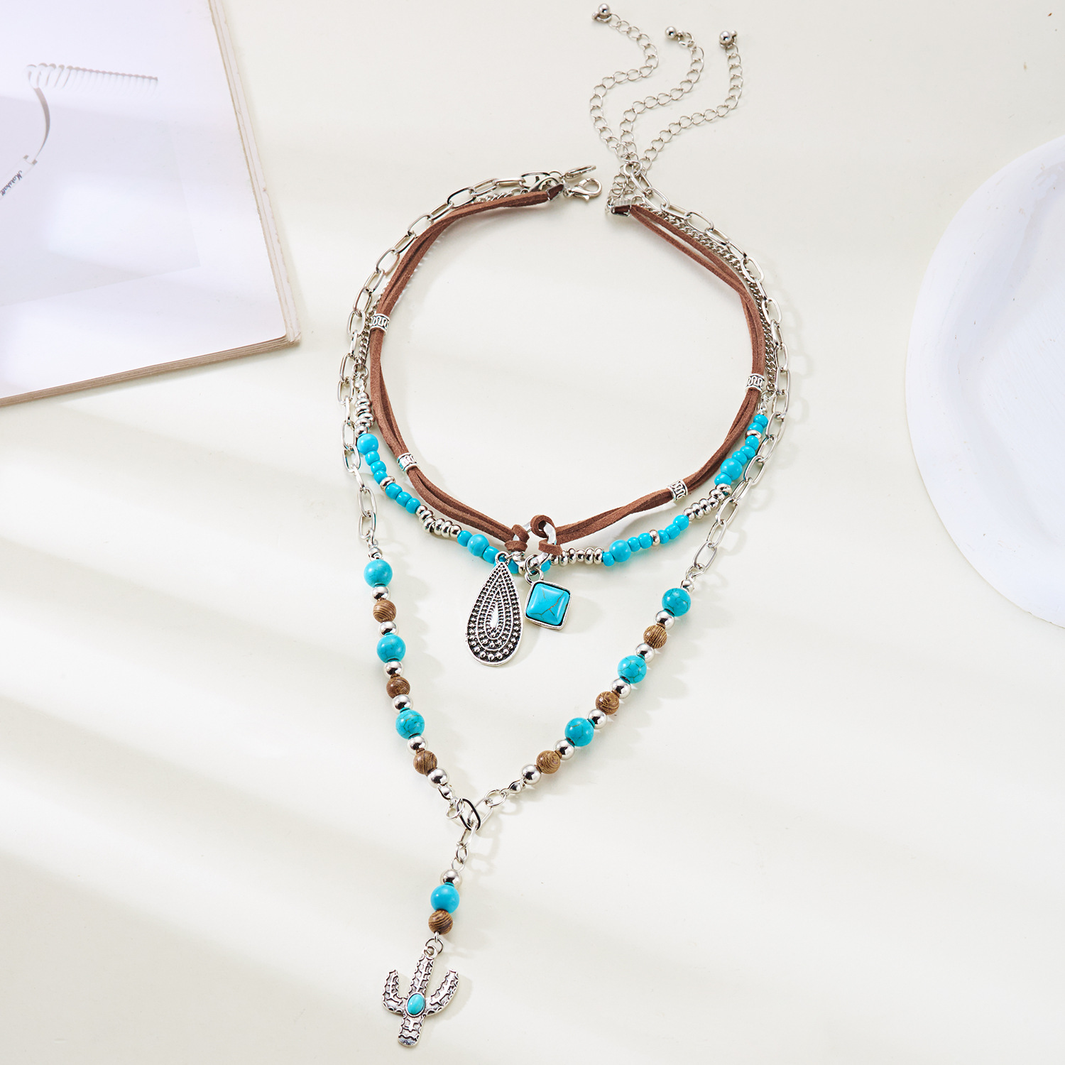 欧美波西米亚度假风串珠几何松石项链 复古西部牛仔多层项链套装