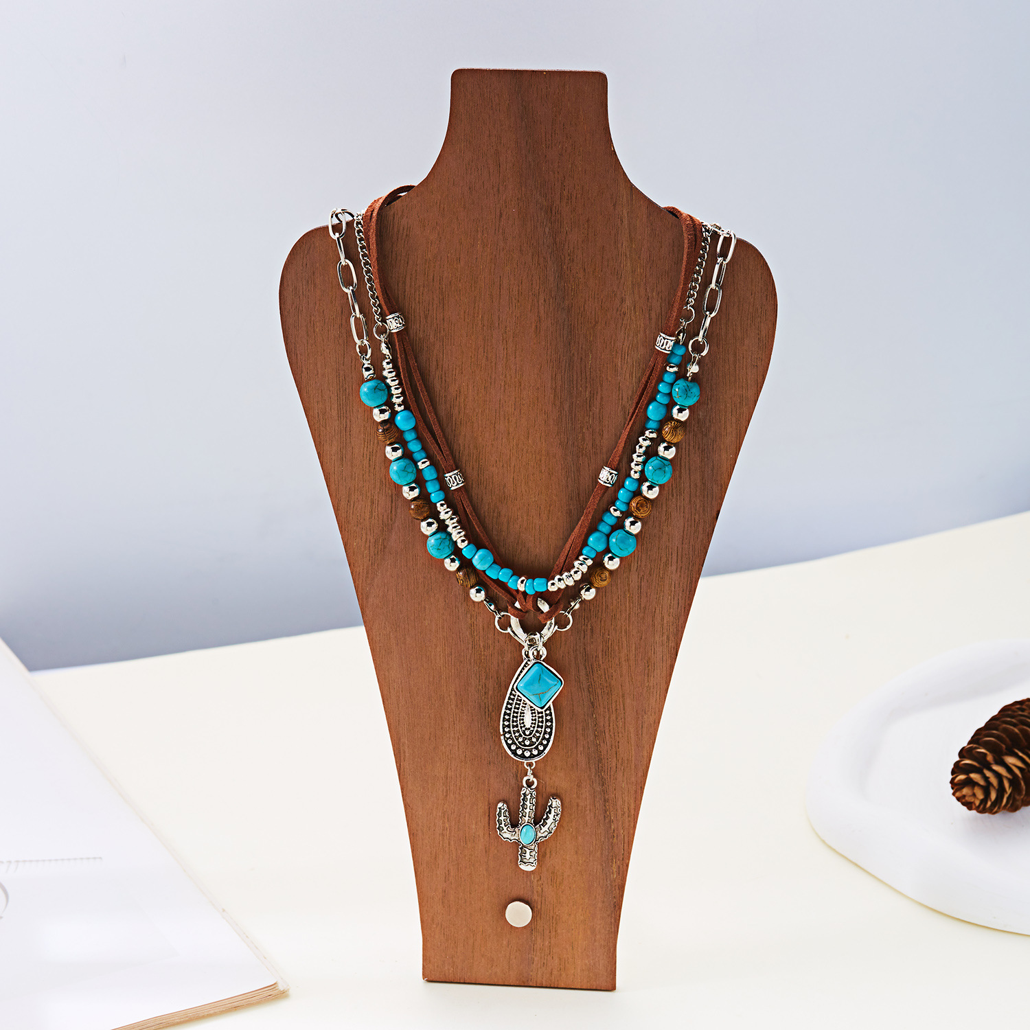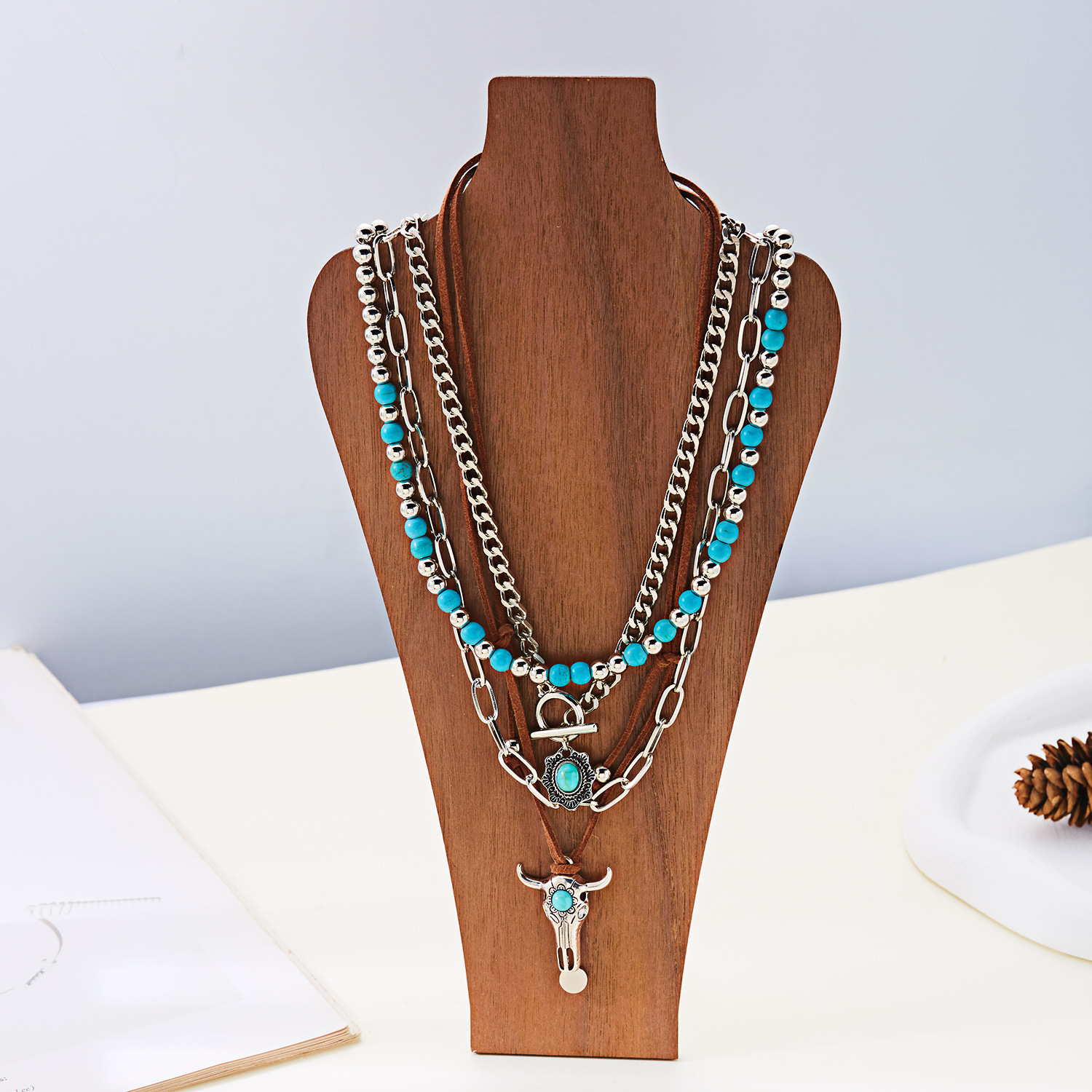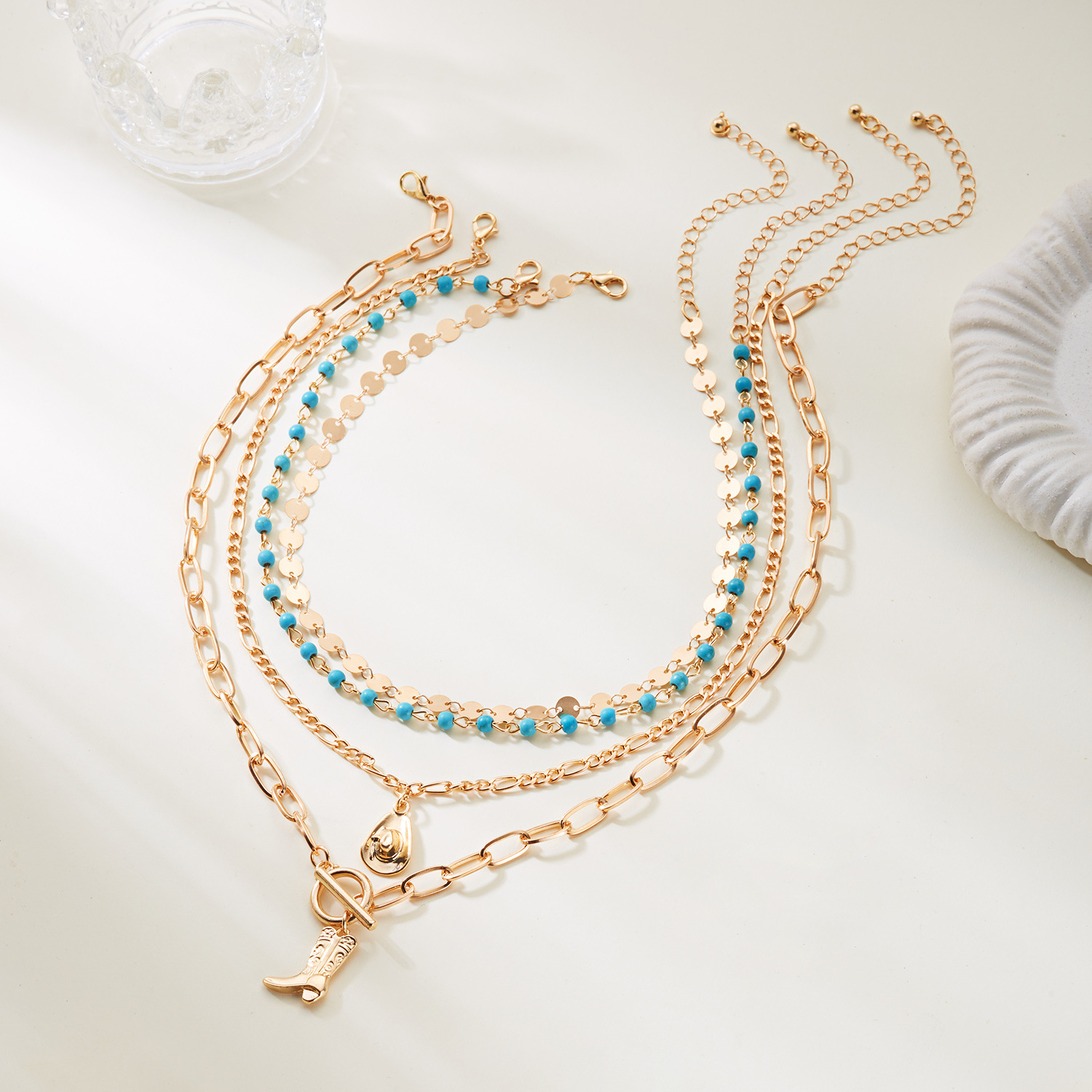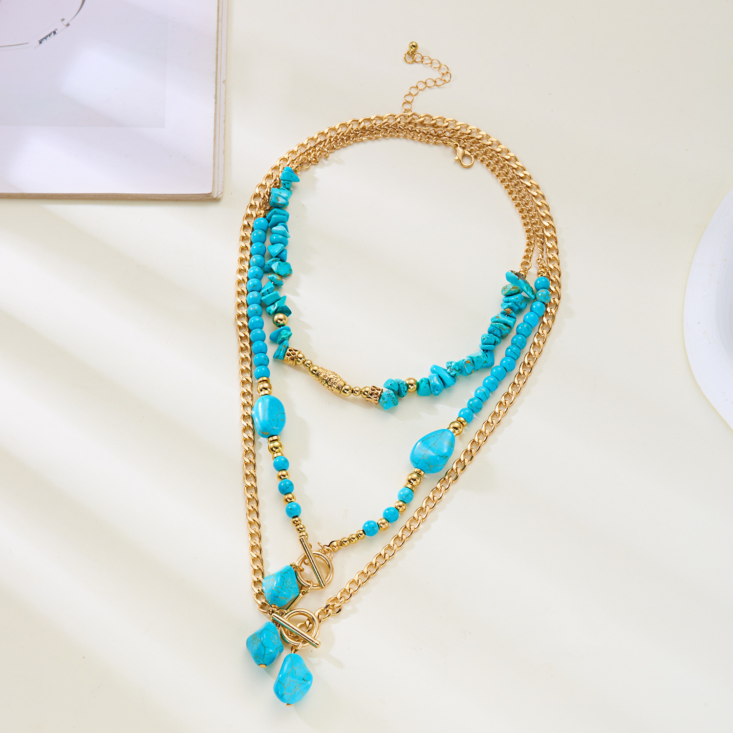 欧美波西米亚度假风串珠几何松石项链 复古西部牛仔多层项链套装