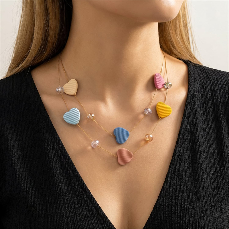 欧美跨境时尚ins风彩色爱心双层项链女个性百搭高级感叠戴毛衣链