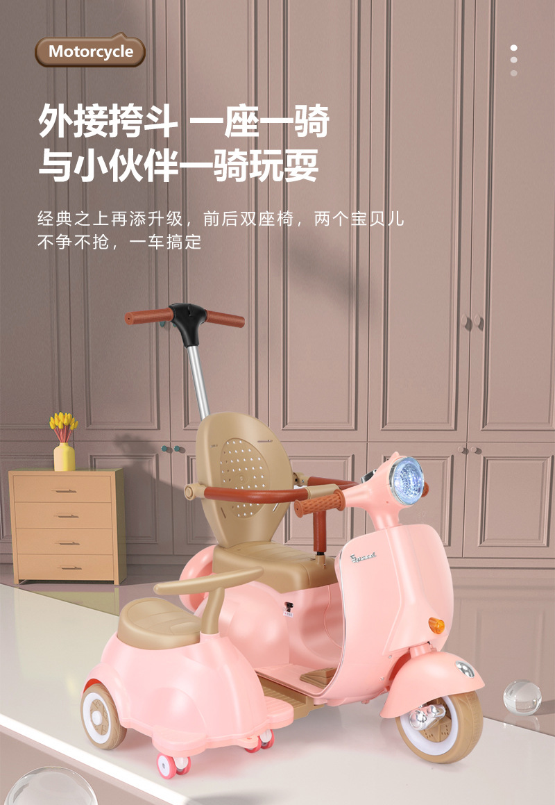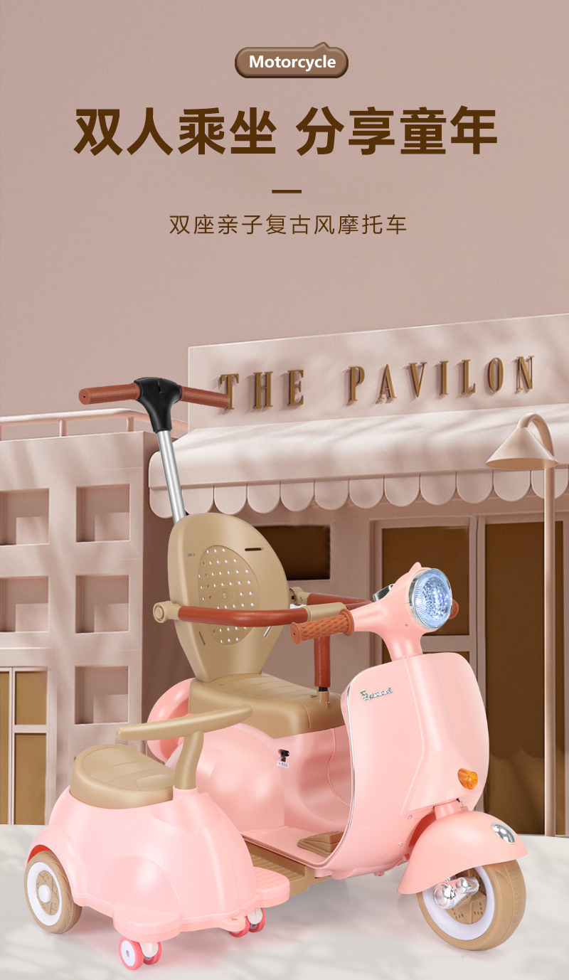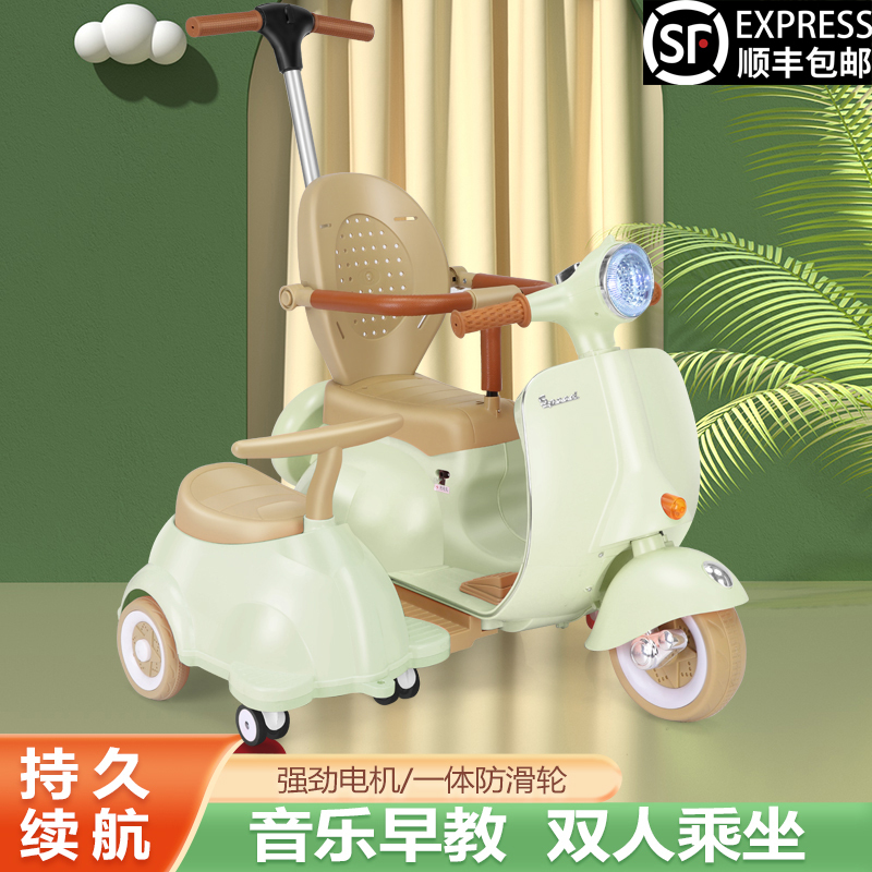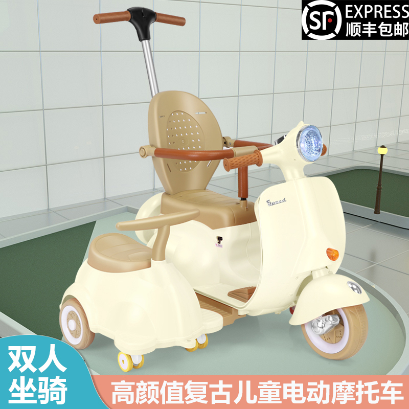 双人儿童电动摩托车复古款可坐人充电宝宝玩具车音乐灯光遥控童车