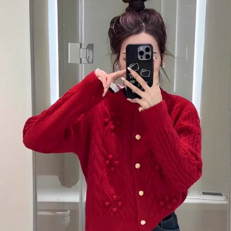 干支年新年レッドデザインパールボタンセーターレディース春ルーズラウンドネックニットカーディガントップ