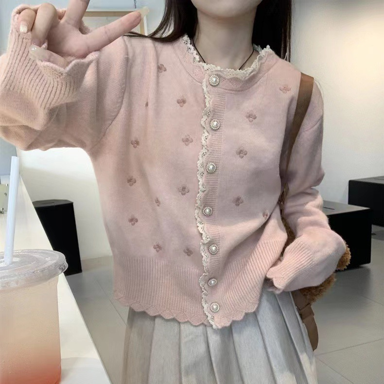 韓系刺繍の小さい花のレースのセーターのコートの女性の春秋の新型のゆったりしている優しい甘い風のニットのカーディガン