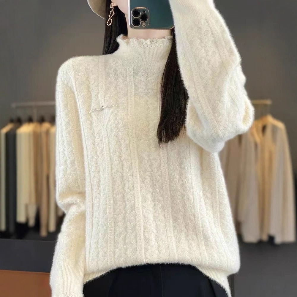 秋冬半高领新款甜美珍珠蕾丝工艺针织衫女黄金貂抗起球毛衣打底衫