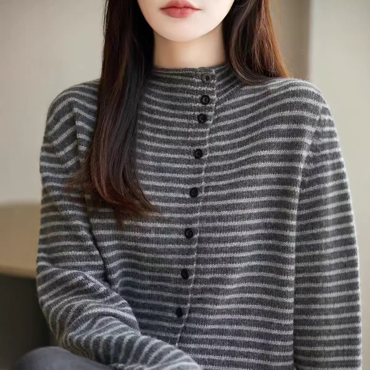 拼色条纹外套毛衣女秋冬新款加厚宽松外搭上衣韩系半高领针织开衫