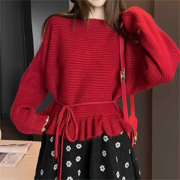 韩系清新简约甜美减龄木耳边收腰系带毛衣2026春秋新款针织上衣女