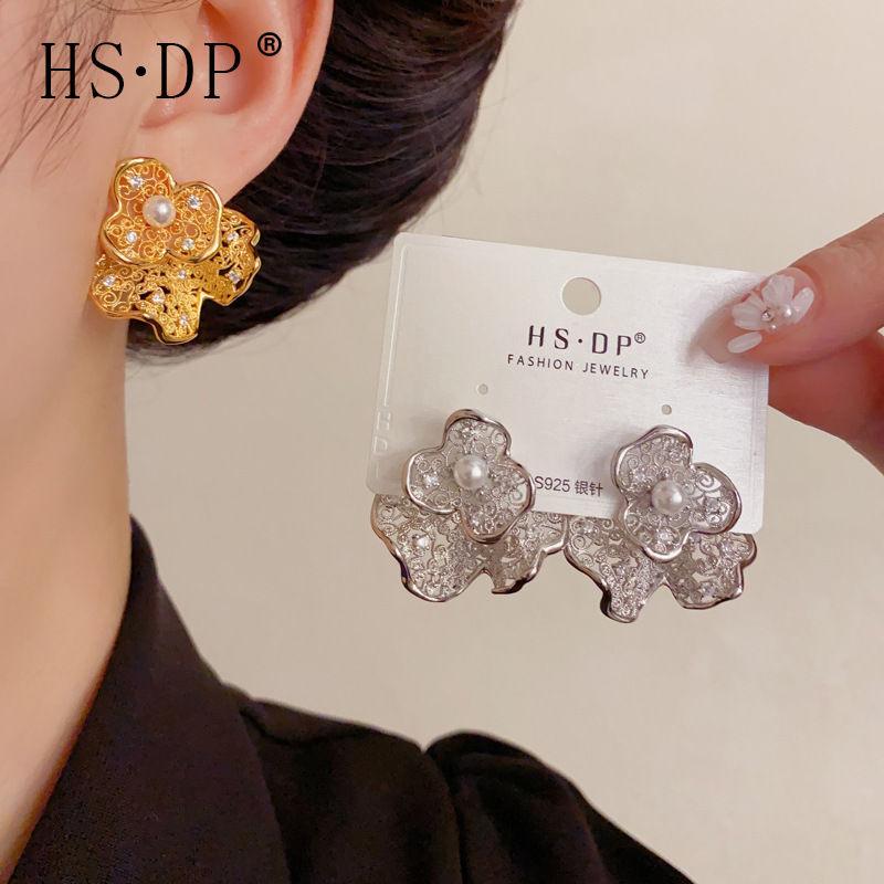 法式精致时尚轻奢锆石花瓣吊珍珠耳坠气质百搭高级感超闪耳环批发
