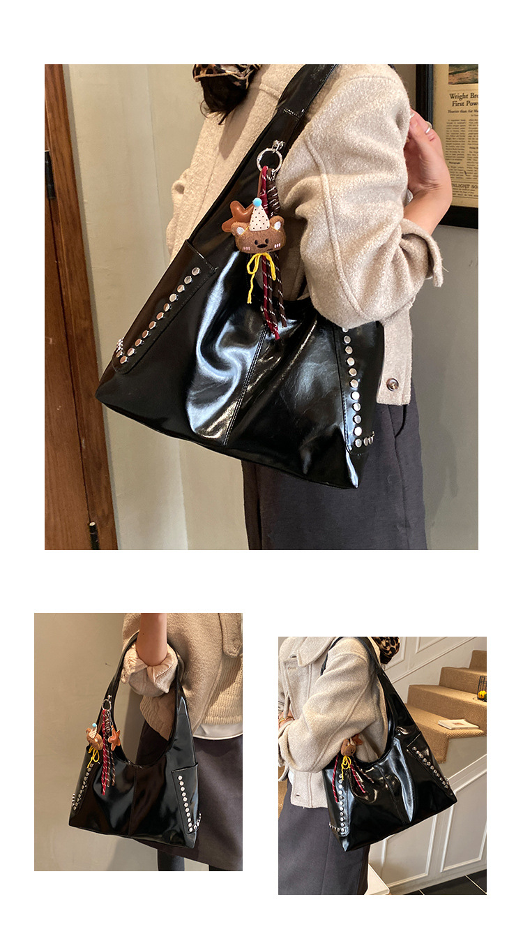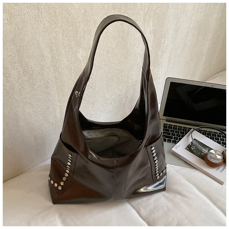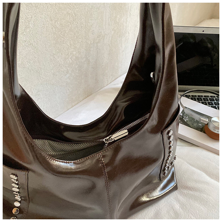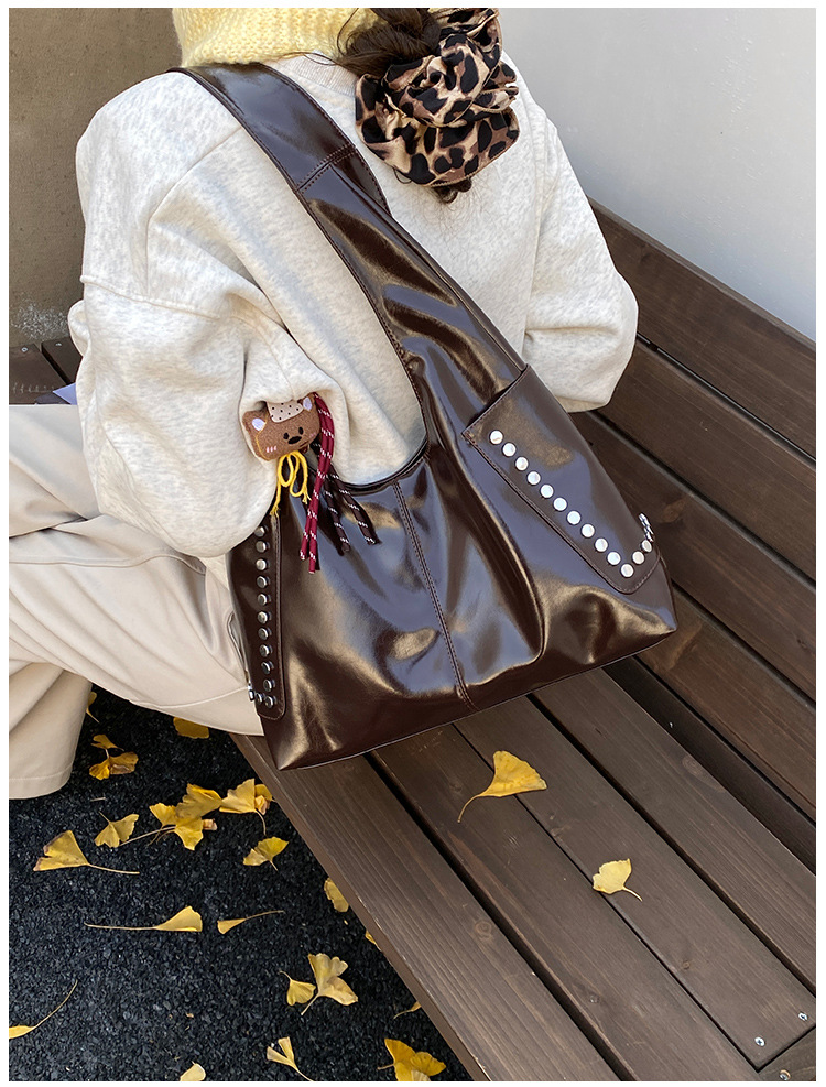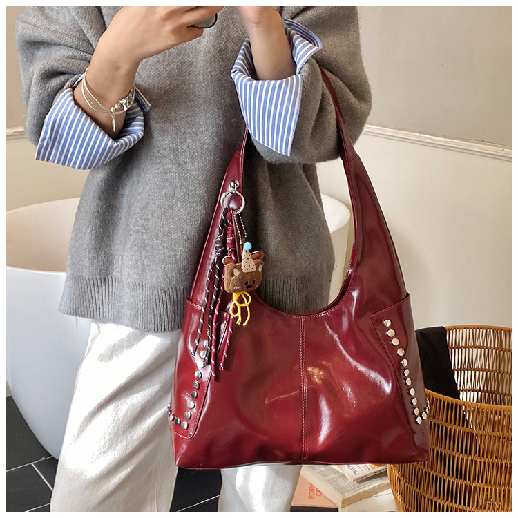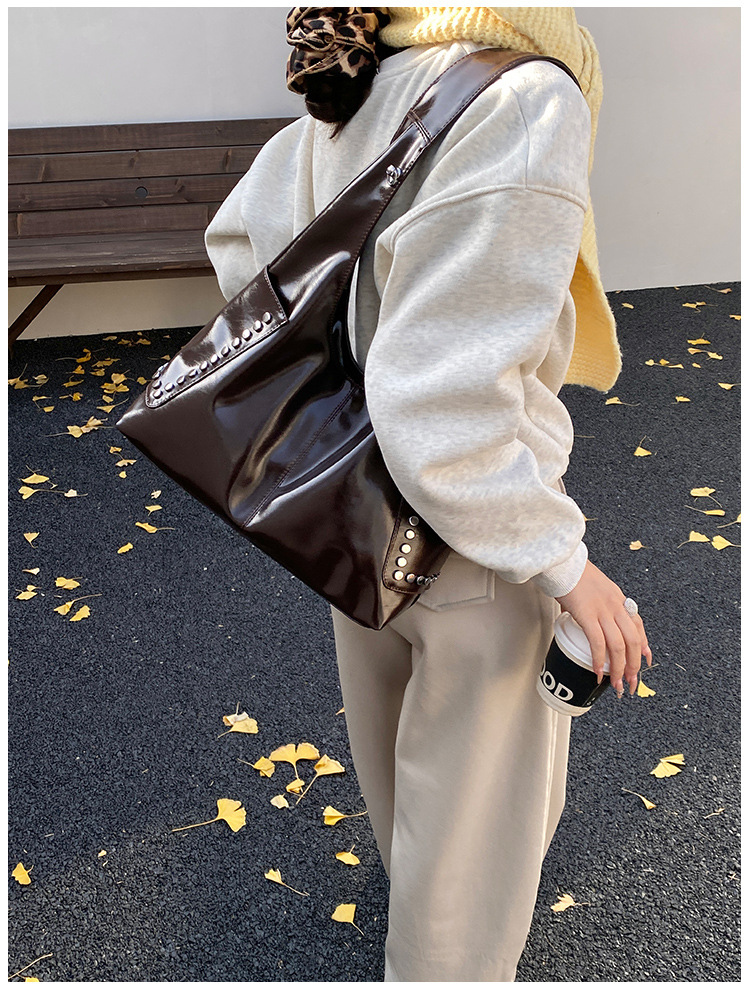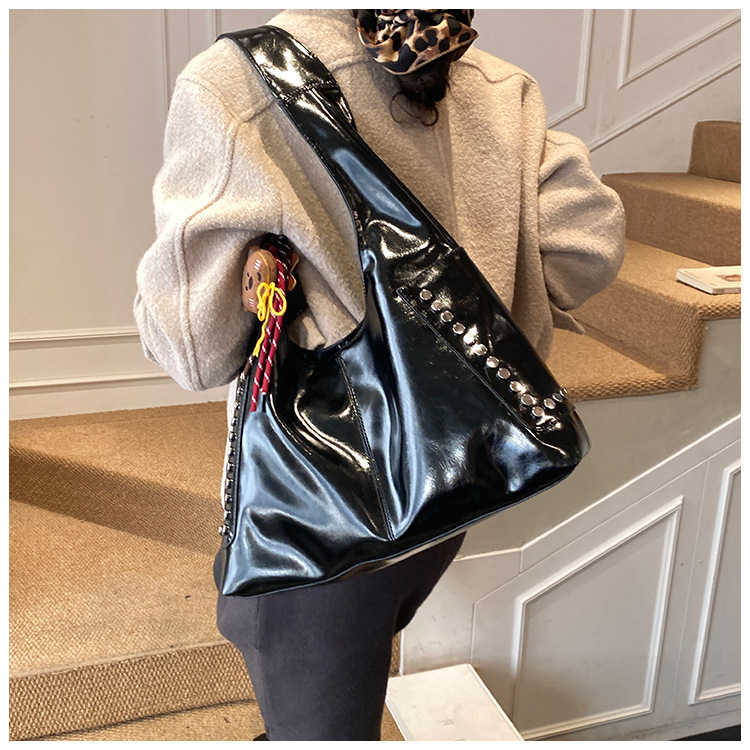 复古亮面铆钉单肩腋下包欧美时尚机车包简约大容量时尚百搭手提包