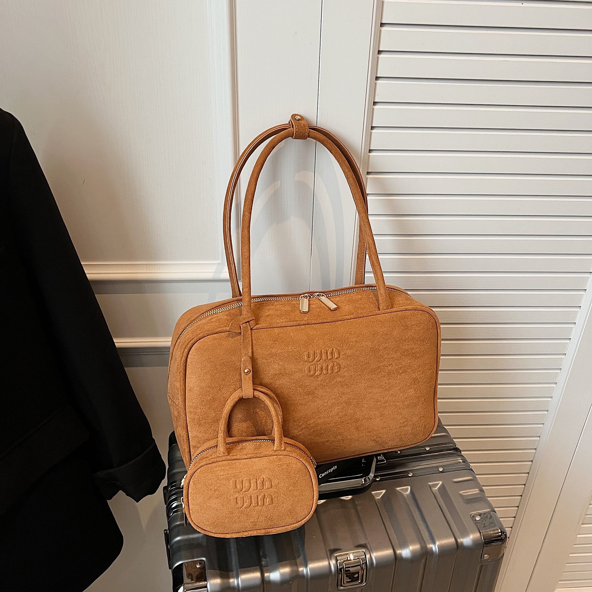 复古麂皮绒MIU单肩包包包质感女士手提包保龄球子母包小众枕头包