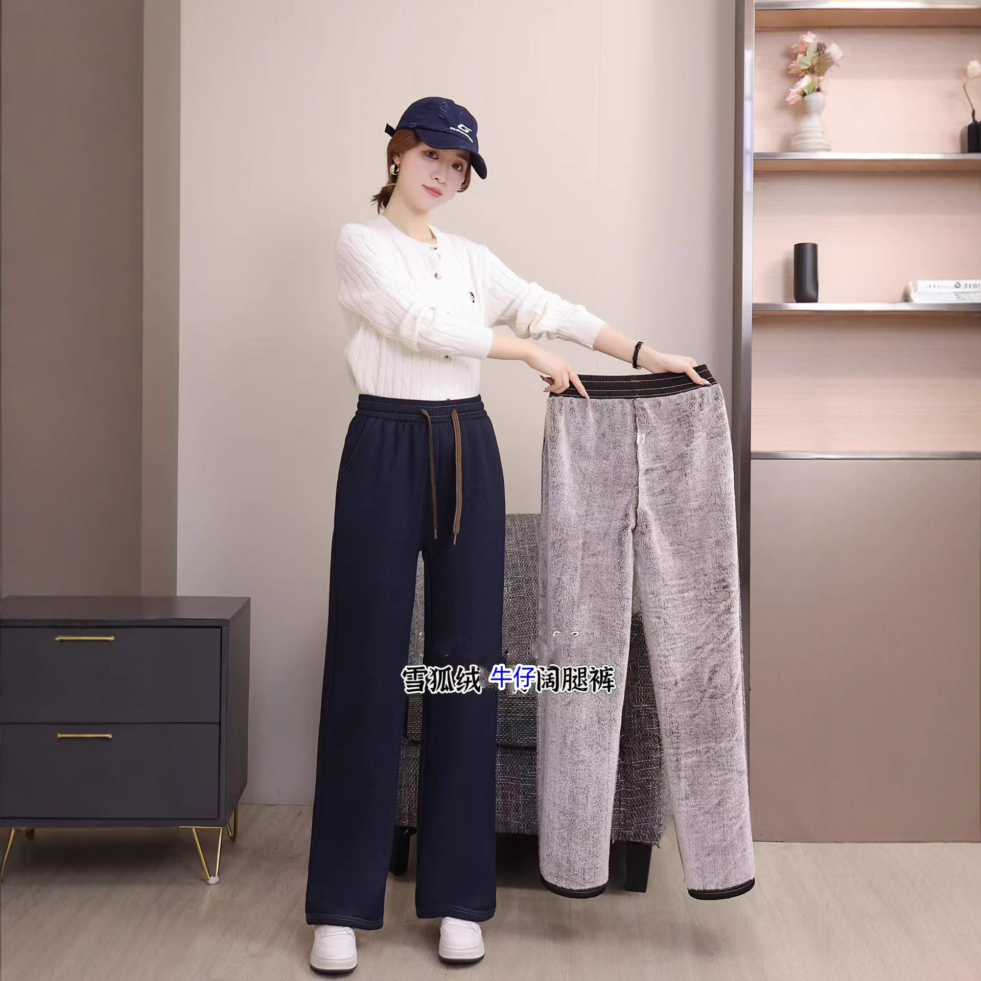 2025冬针织仿牛仔时尚潮流配布拉绳宽松休闲直筒裤加雪狐绒厚长裤