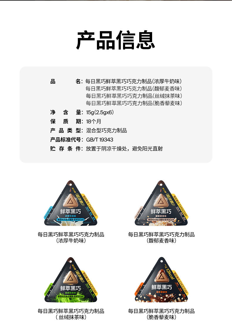 每日黑巧鲜萃黑巧袋装纯可可脂抹茶黑巧克力运动健身零食15g