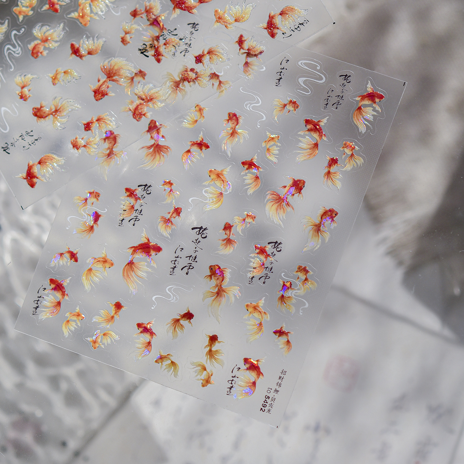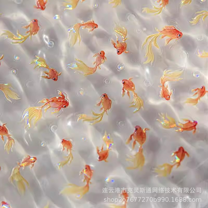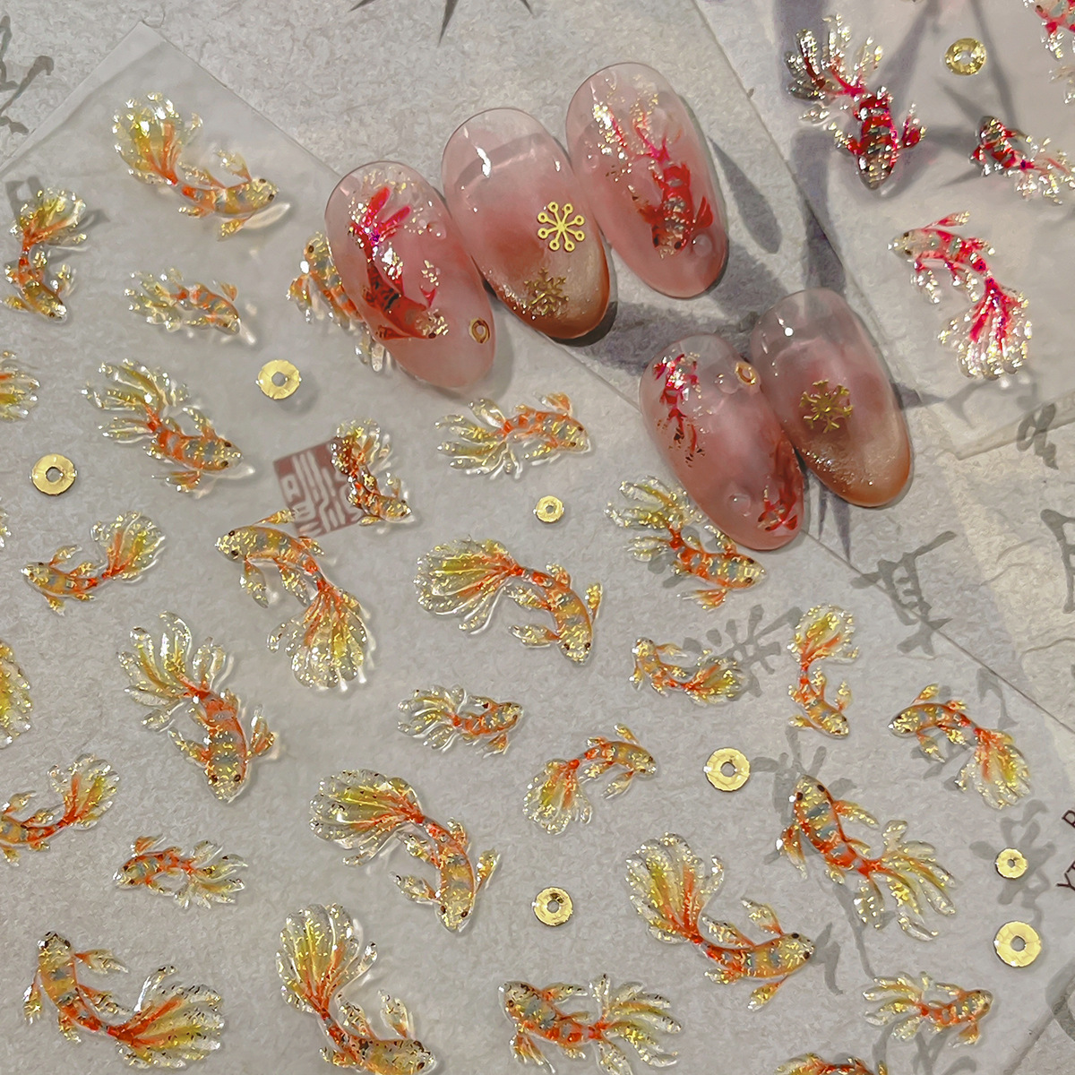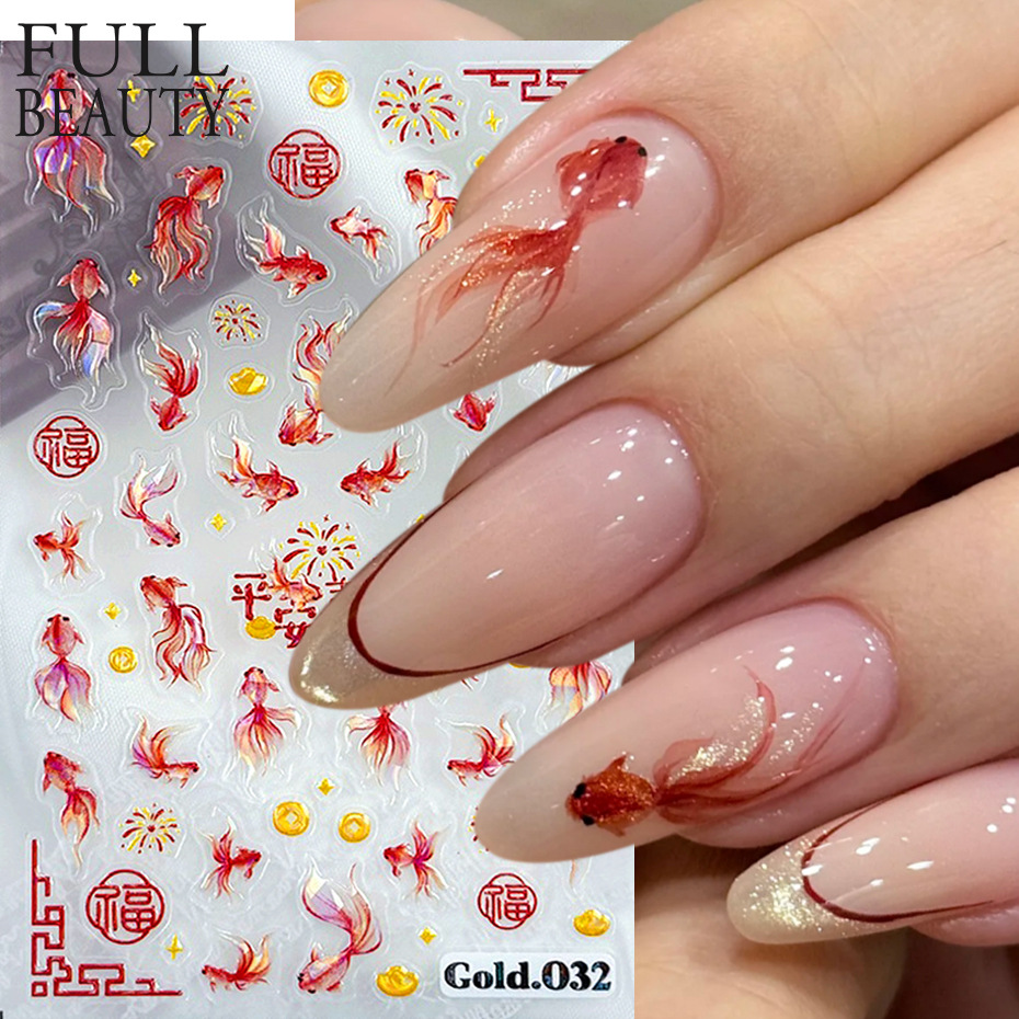 新中式美甲富贵锦鲤贴纸贝壳光金鱼国潮好运鱼浮雕背胶指甲装饰品