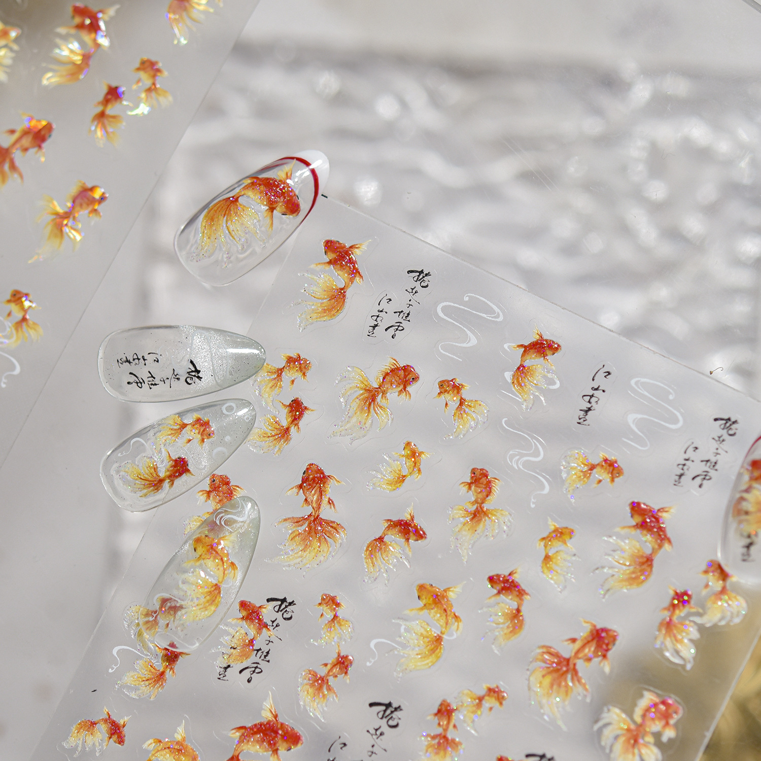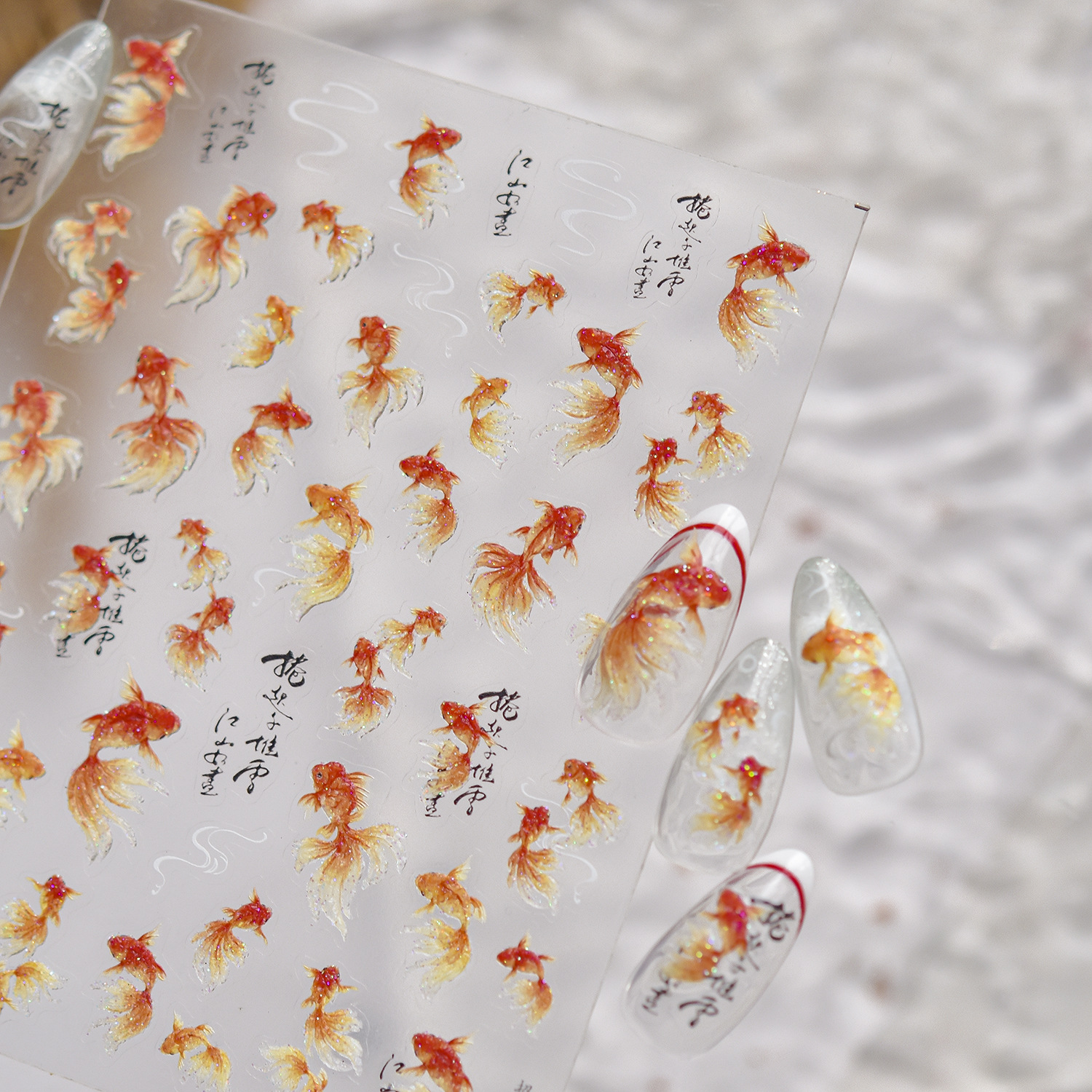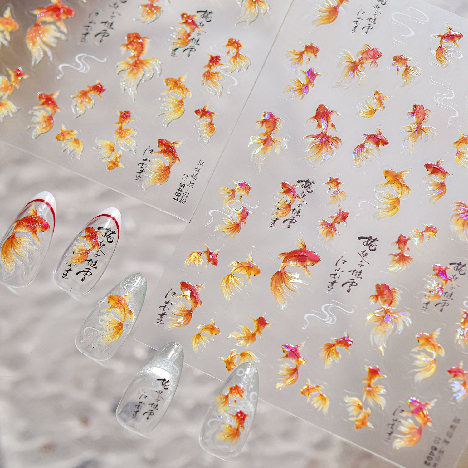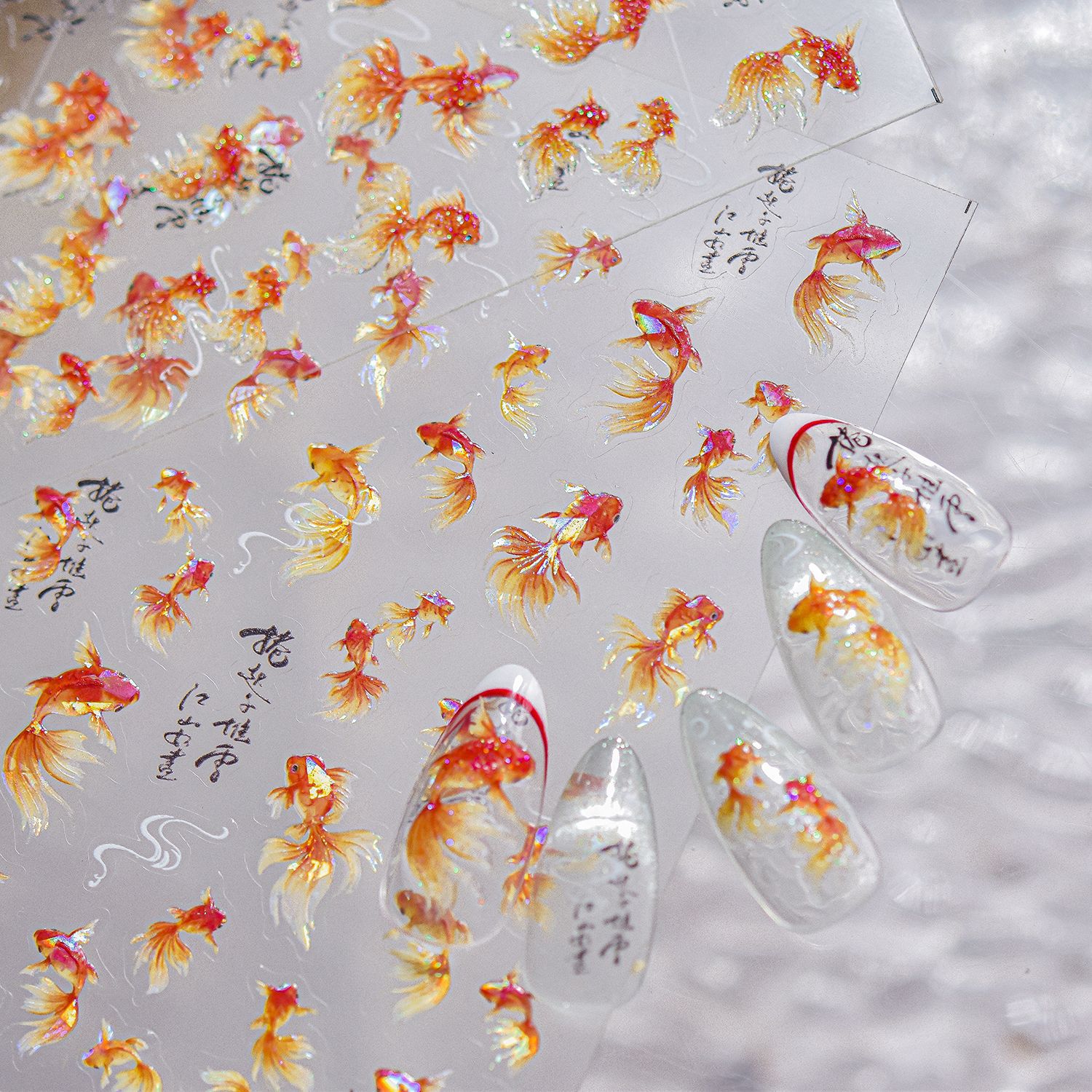 新中式美甲富贵锦鲤贴纸贝壳光金鱼国潮好运鱼浮雕背胶指甲装饰品