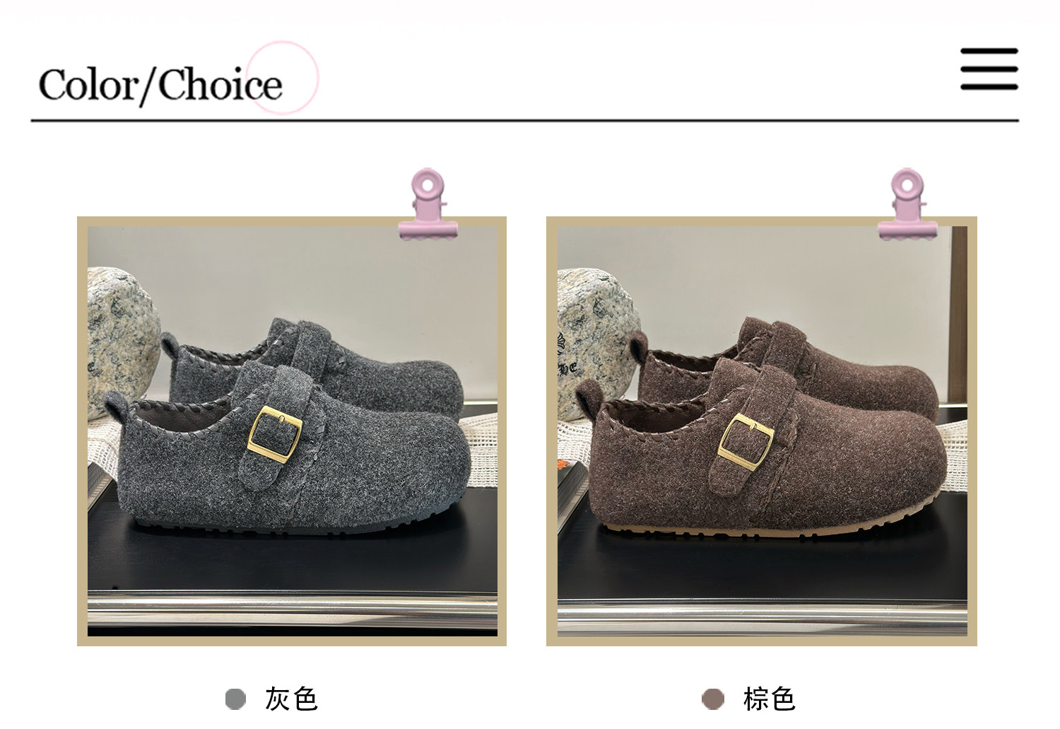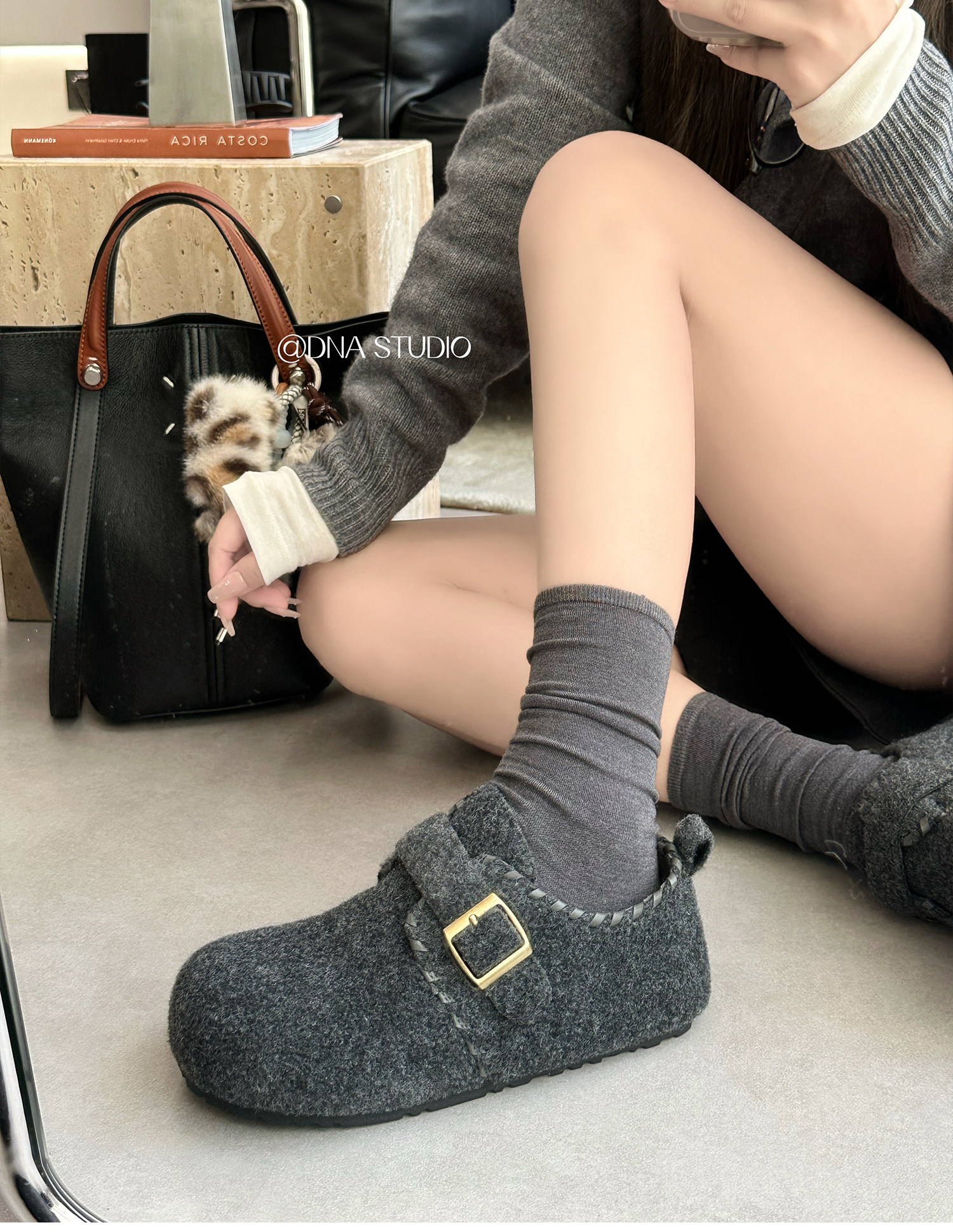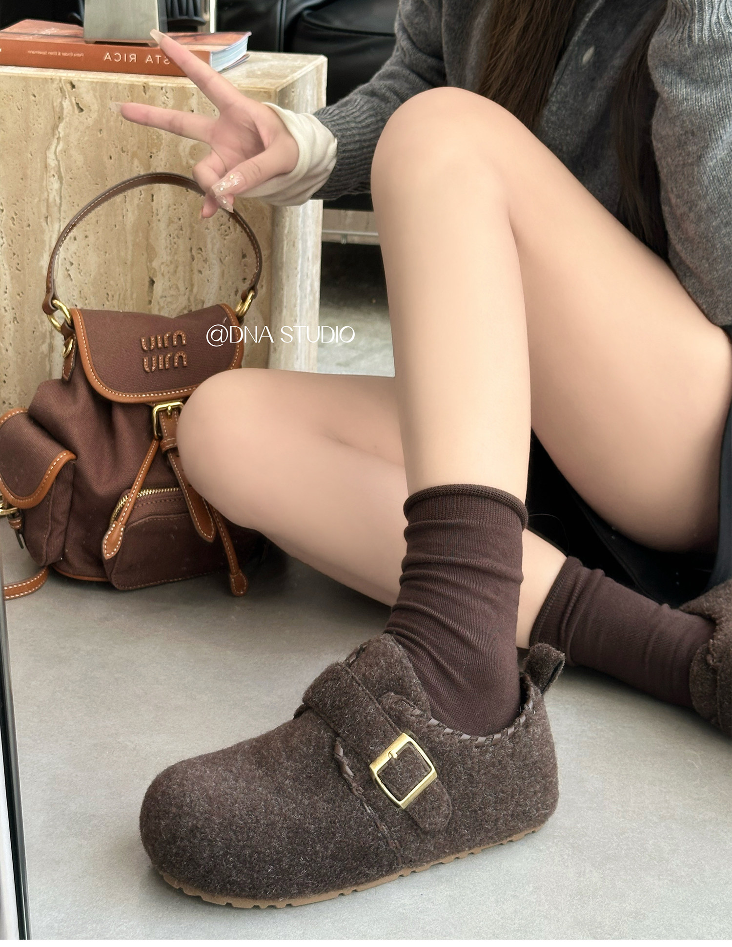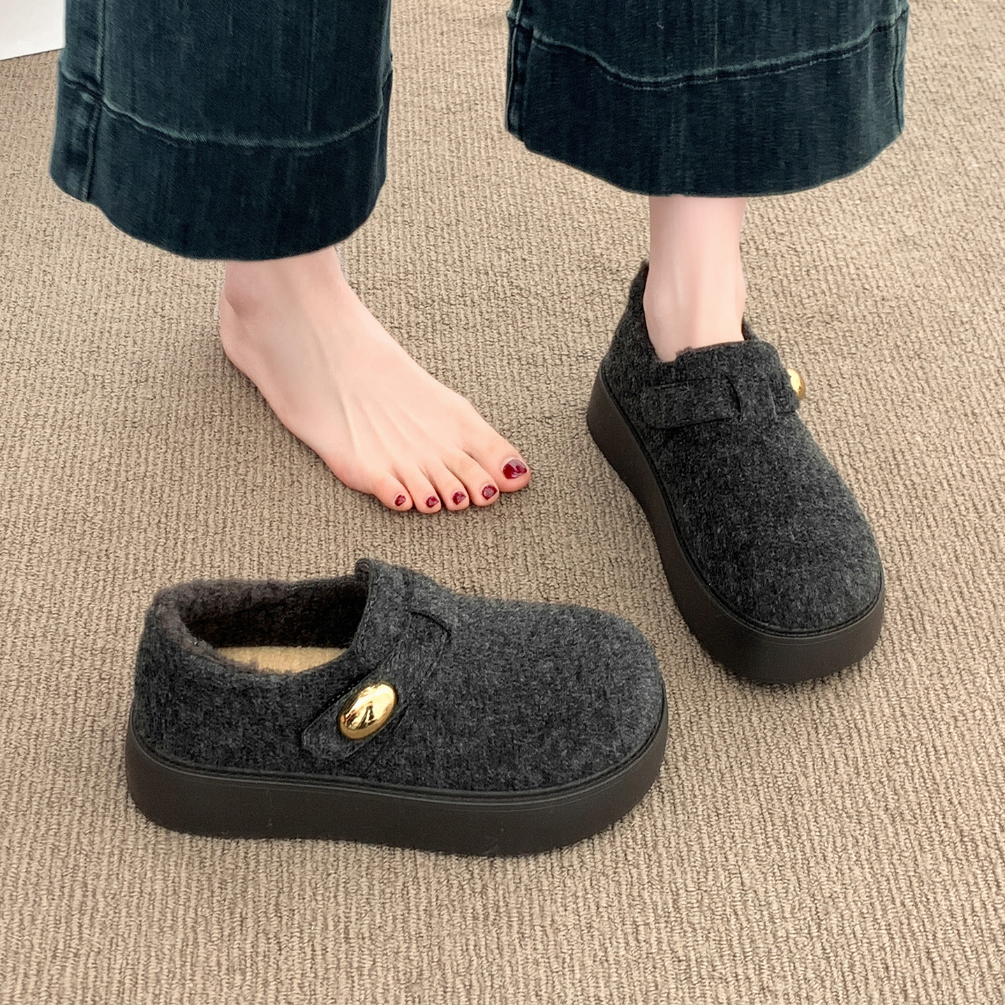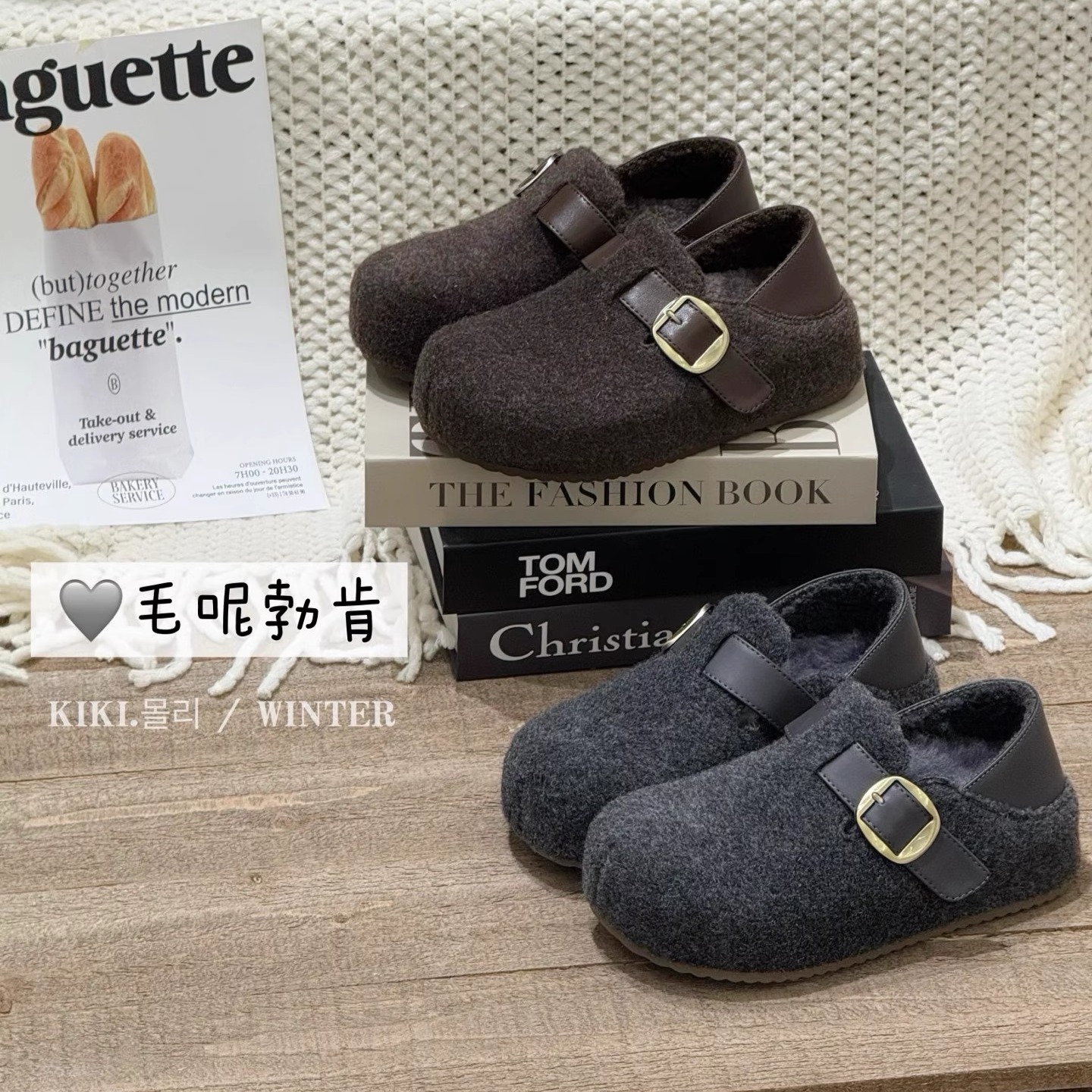 毛呢勃肯鞋女乐福2025秋冬新款加绒保暖棉鞋一脚蹬懒人平底豆豆鞋