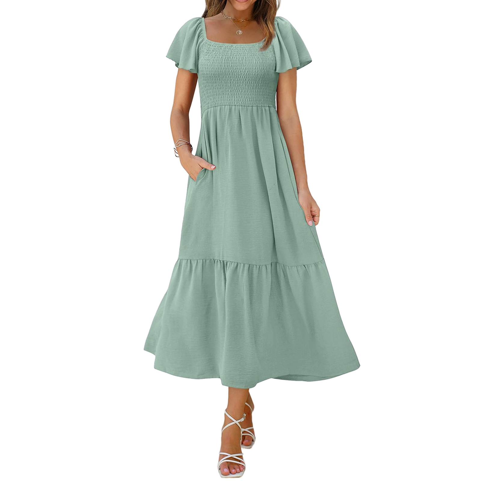 クロスボーダーの新型2025アマゾンの頭の方襟のハスの葉の袖の高い腰のガードルのしわの純色のワンピース