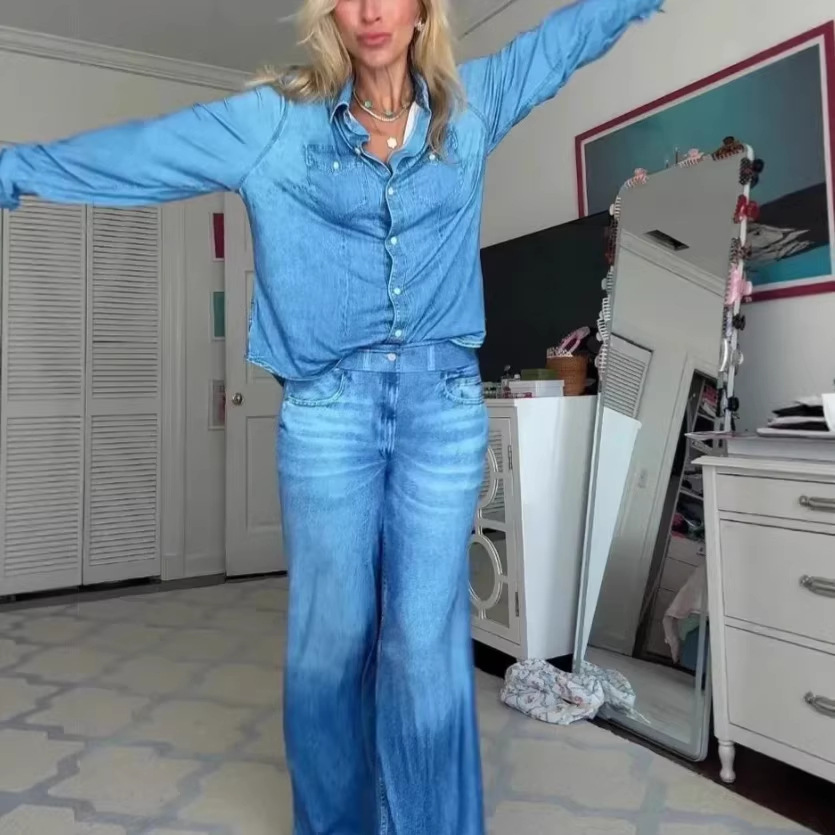 2025欧美新款外贸跨境亚马逊弹力宽松牛仔色套装休闲时尚女两件套