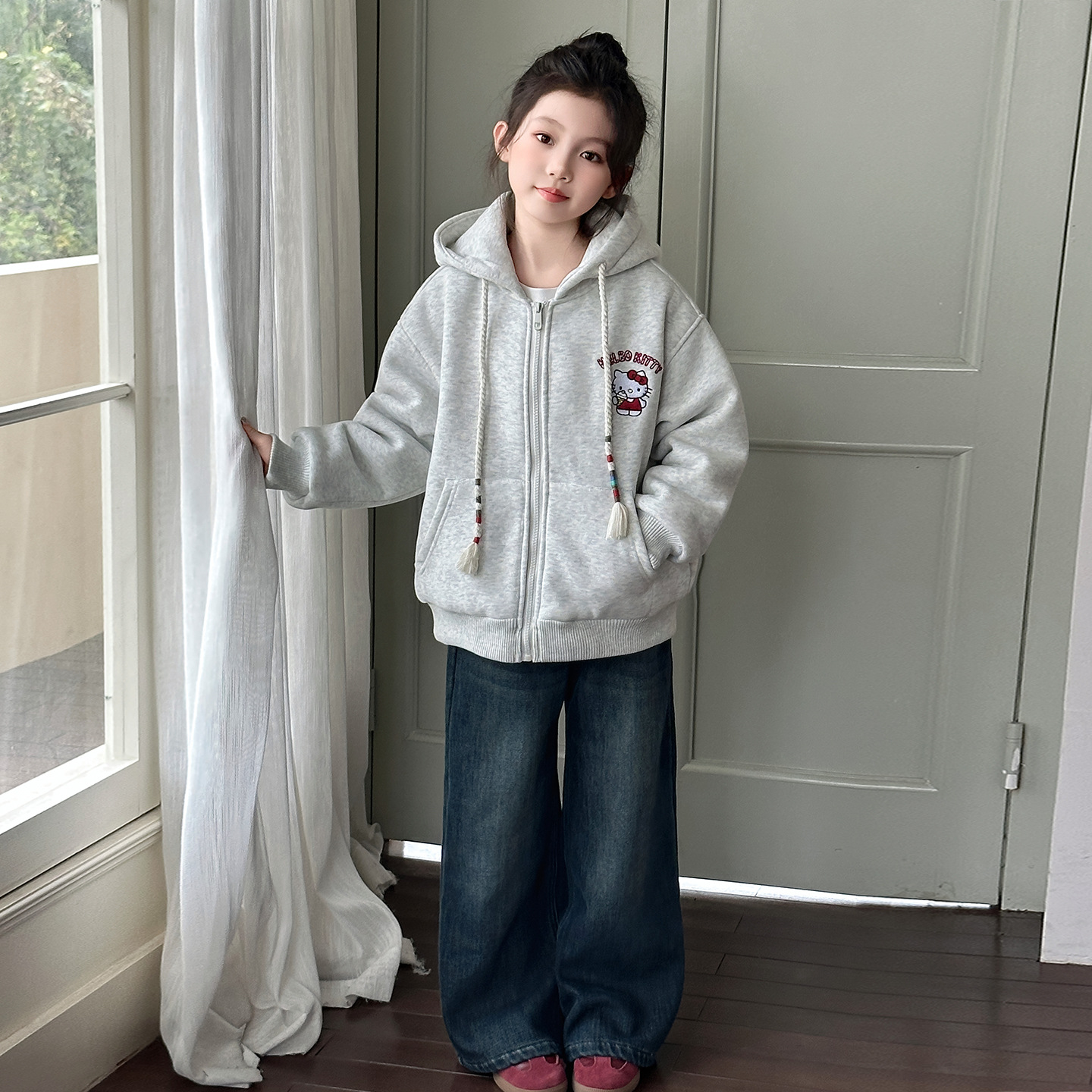 卡通kt猫加绒牛仔裤2025新款女大童时髦洋气宽松加厚休闲裤弯刀裤