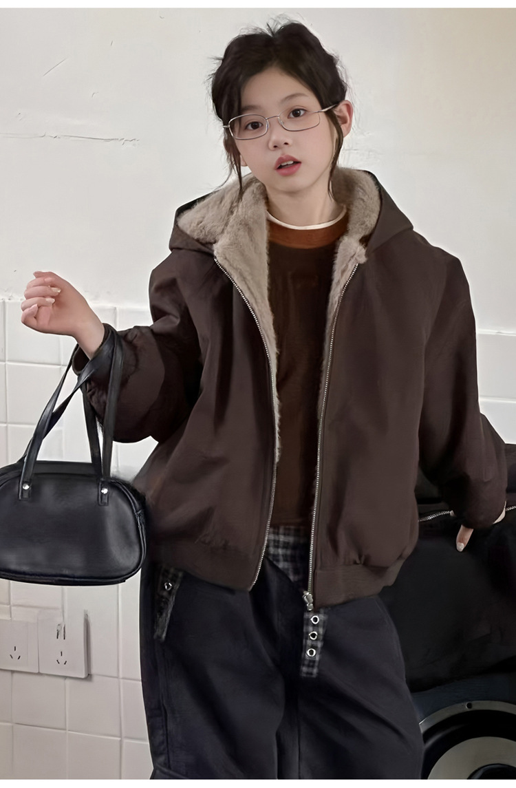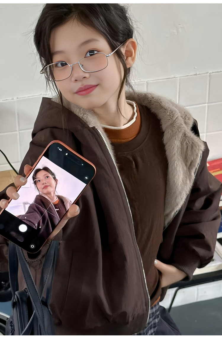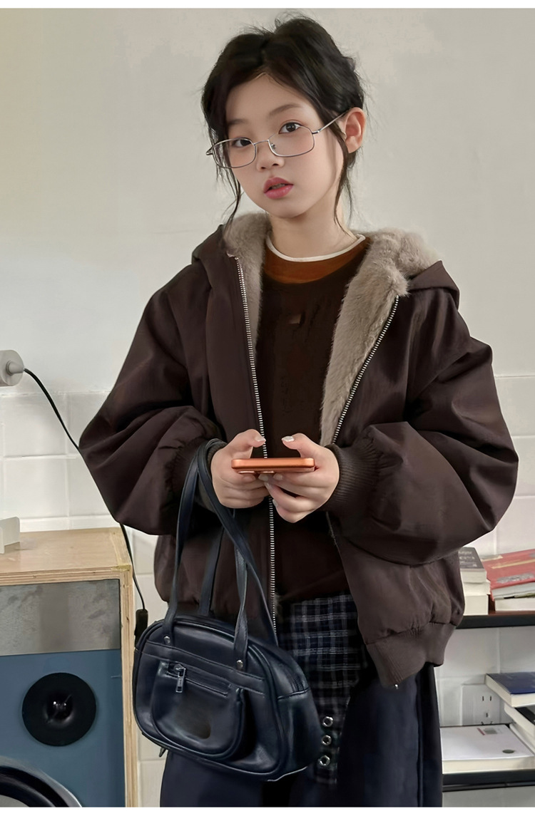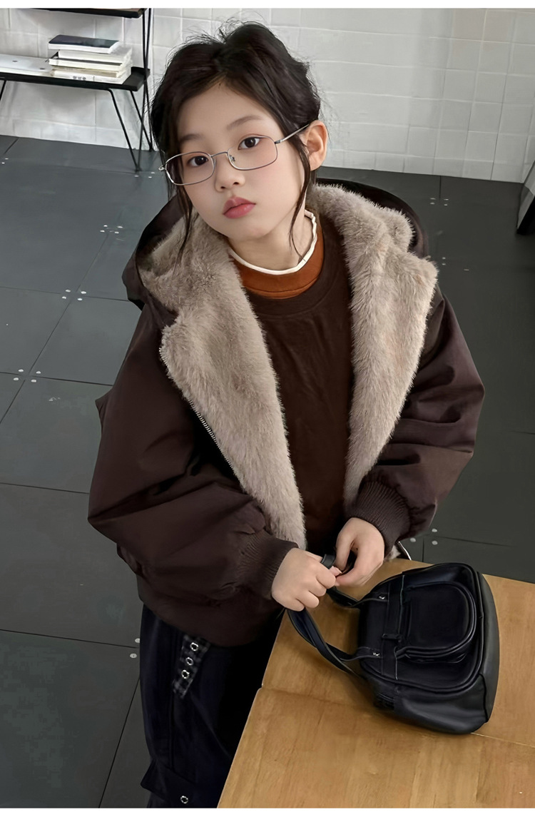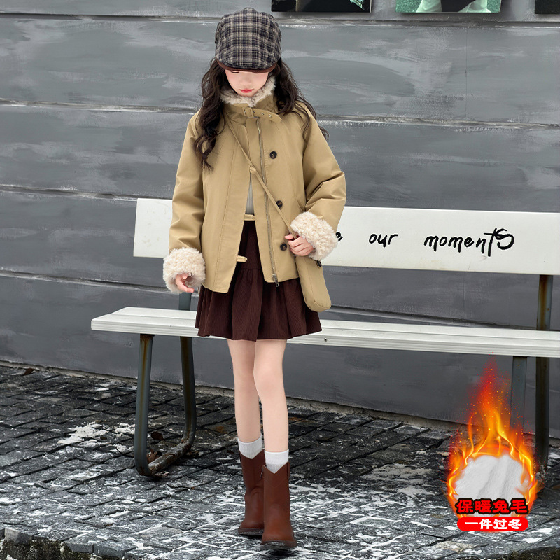 女童加绒加厚派克服2025冬装新款大童韩版洋气兔毛夹克工装外套潮