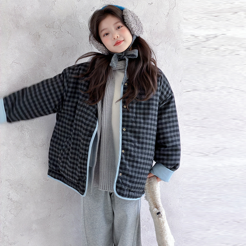 女童双面穿夹棉棉服2025冬装新款大童韩版洋气时髦格子棉衣外套