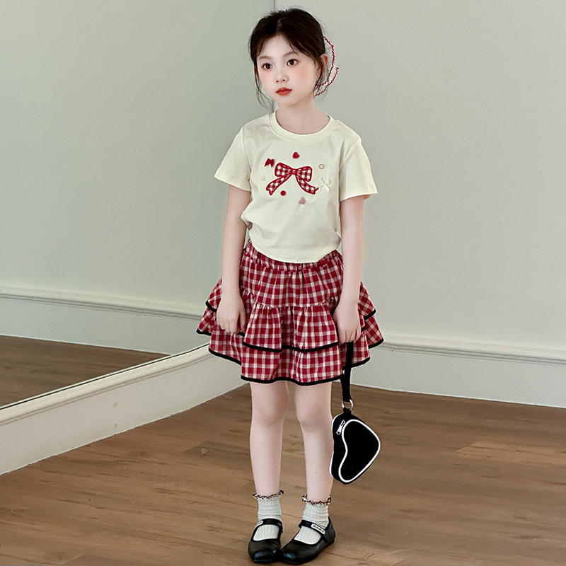 女の子韓国風カレッジスタイルセット2025夏新作大きい子供向けおしゃれ半袖Tシャツチェック柄ケーキスカートツーピースセット