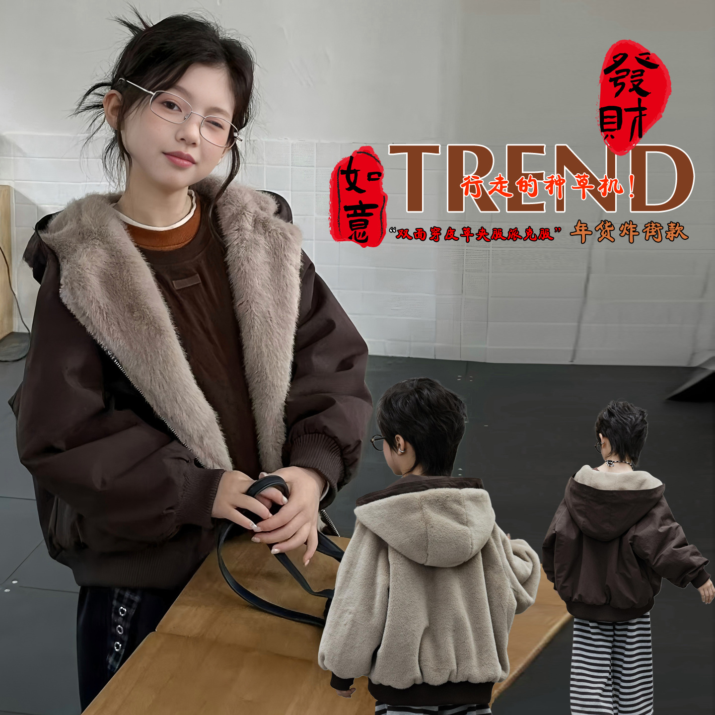 儿童两面穿仿皮草外套2025冬装新款大童女孩时髦洋气加厚保暖外套
