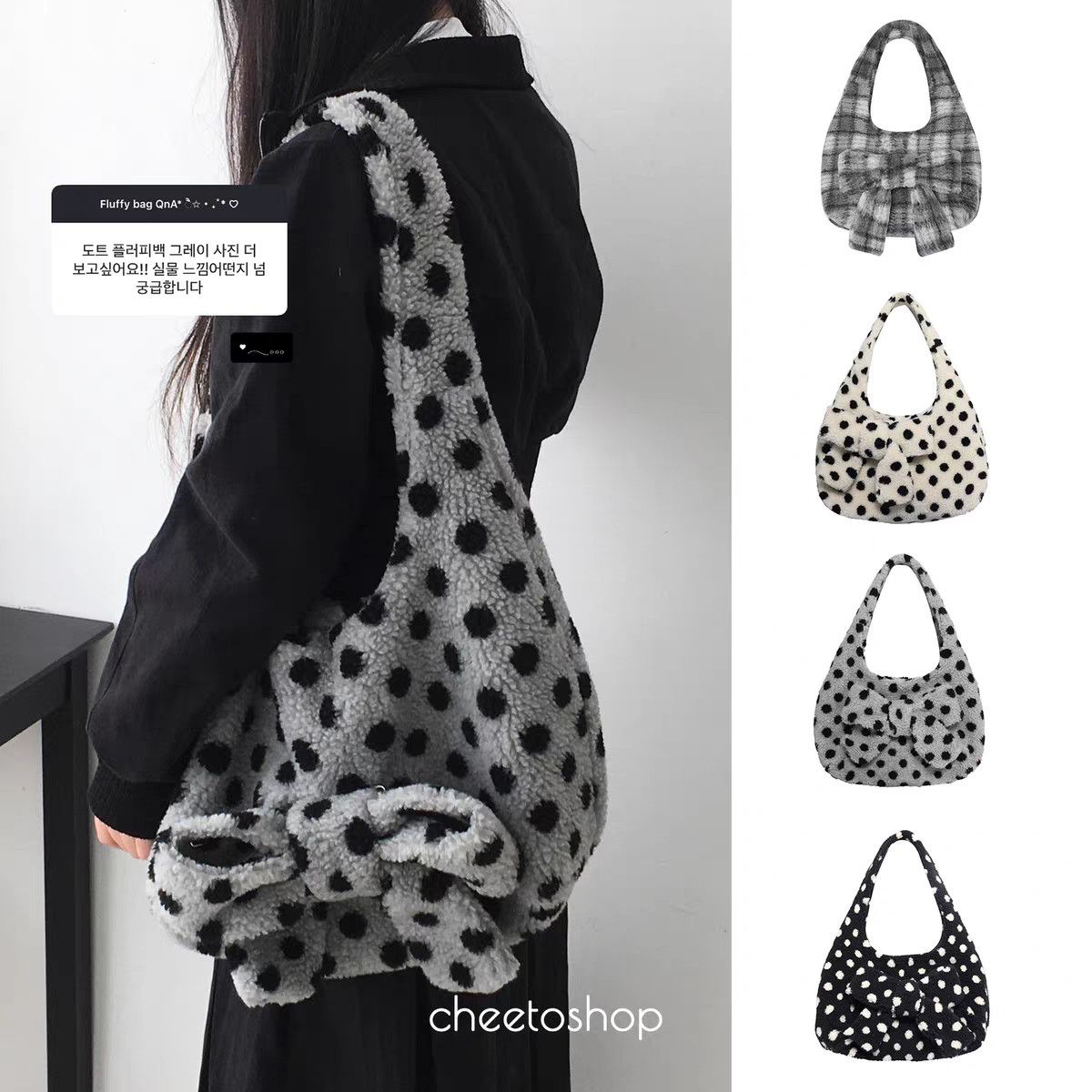 sio韩国25秋冬新色格纹蝴蝶结可拆卸波点蓬松毛茸单肩包