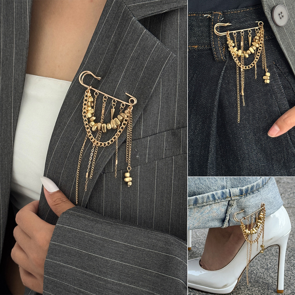 欧米風クロスボーダーinsメタルチェーンフリンジピンブローチ デザイン感のある砕石リベットパンツアンクレット短縮装飾