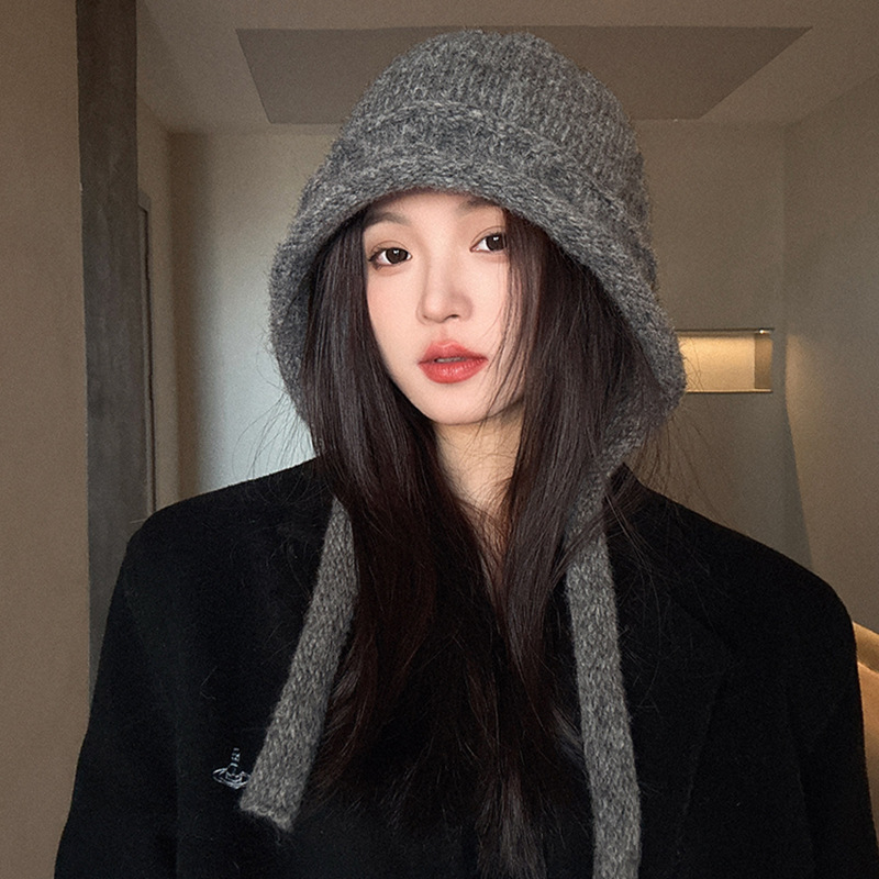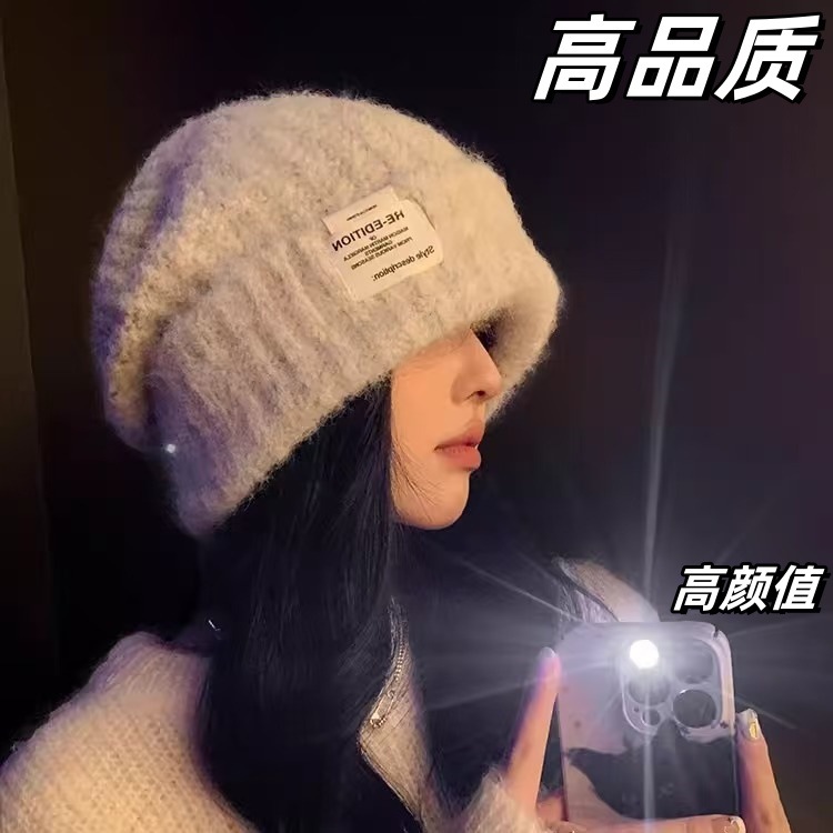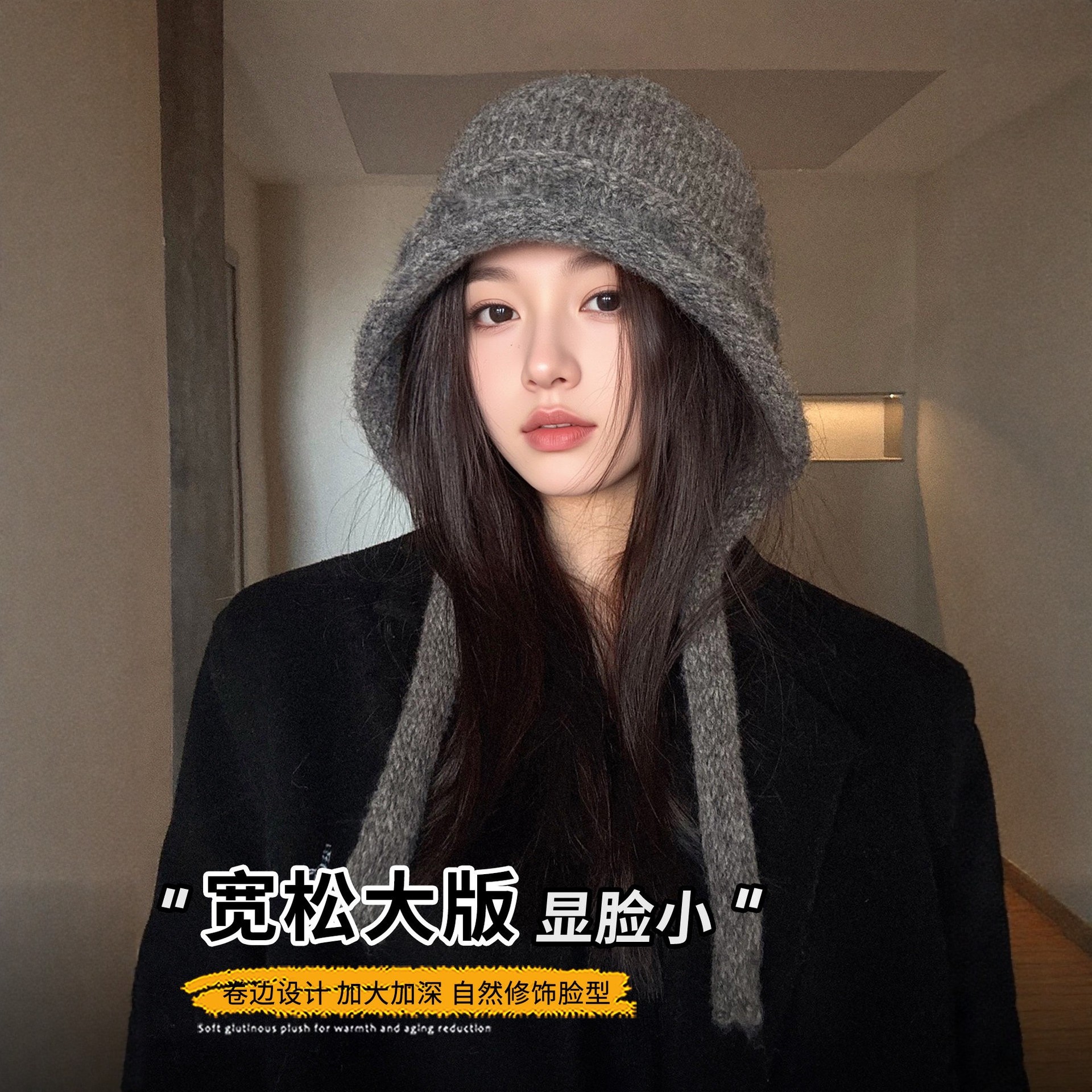 韓国風秋冬新作、毛糸の重ね帽子、頭囲が大きくても小顔効果、カップル向けゆったり耳当て付き暖かい帽子、大きなつば付き
