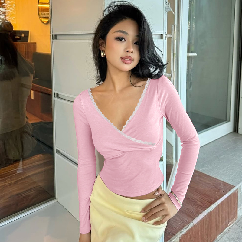 跨境外贸欧美风时尚V领蕾丝花边拼接设计感修身短款上衣秋季T恤女