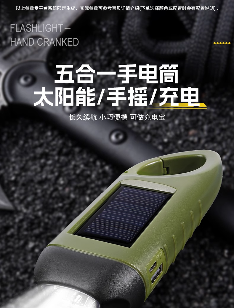 多功能太阳能手电筒强光手摇充电家用停电应急户外露营便携照明灯