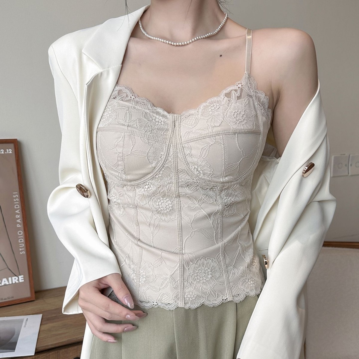 法式纯欲风蕾丝美背磨毛加绒吊带背心女带胸垫复古百搭显瘦内衣