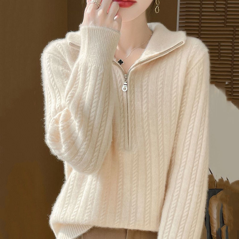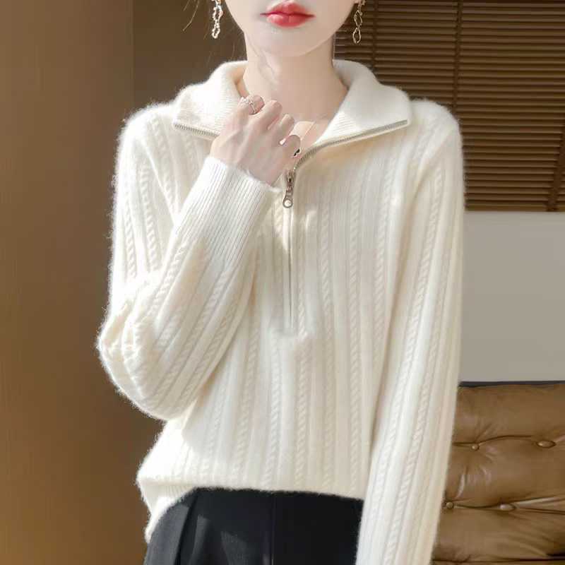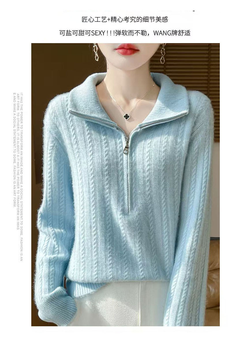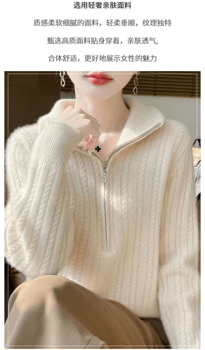 秋冬新款半拉链立领宽松长袖羊毛毛衣针织衫仿羊毛衫女士麻花上衣