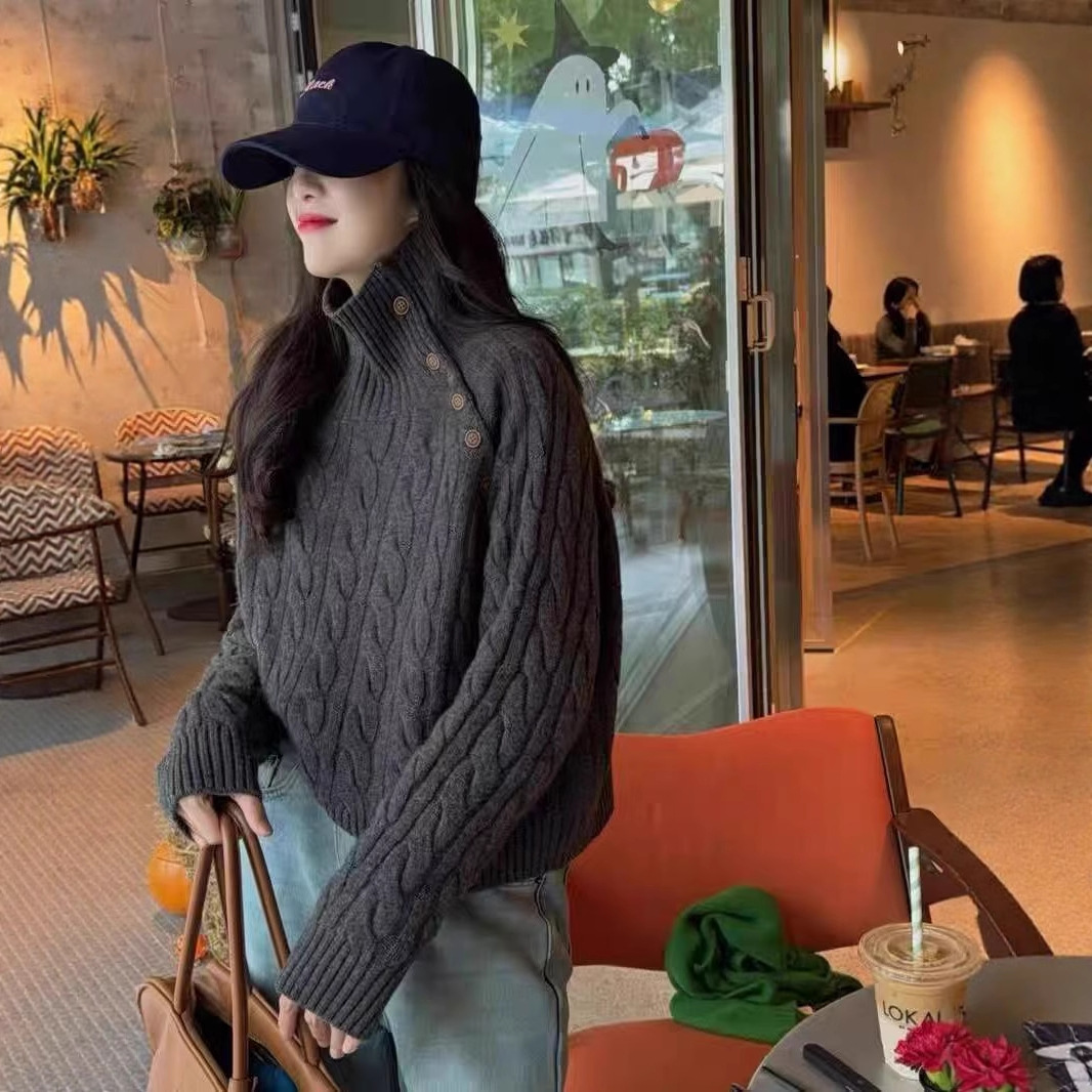 慵懒风100%羊毛衫女秋冬斜扣麻花高领针织衫毛衣宽松显瘦打底上衣