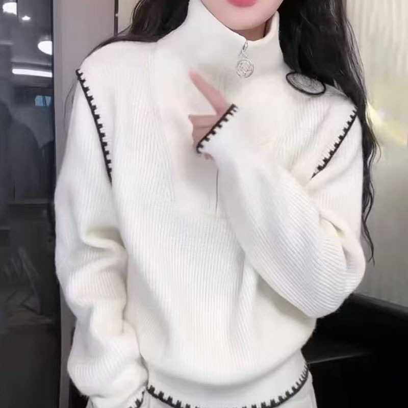 秋冬装新款内搭翻领半拉链纯色针织衫女韩版宽松长袖套头毛衣女装