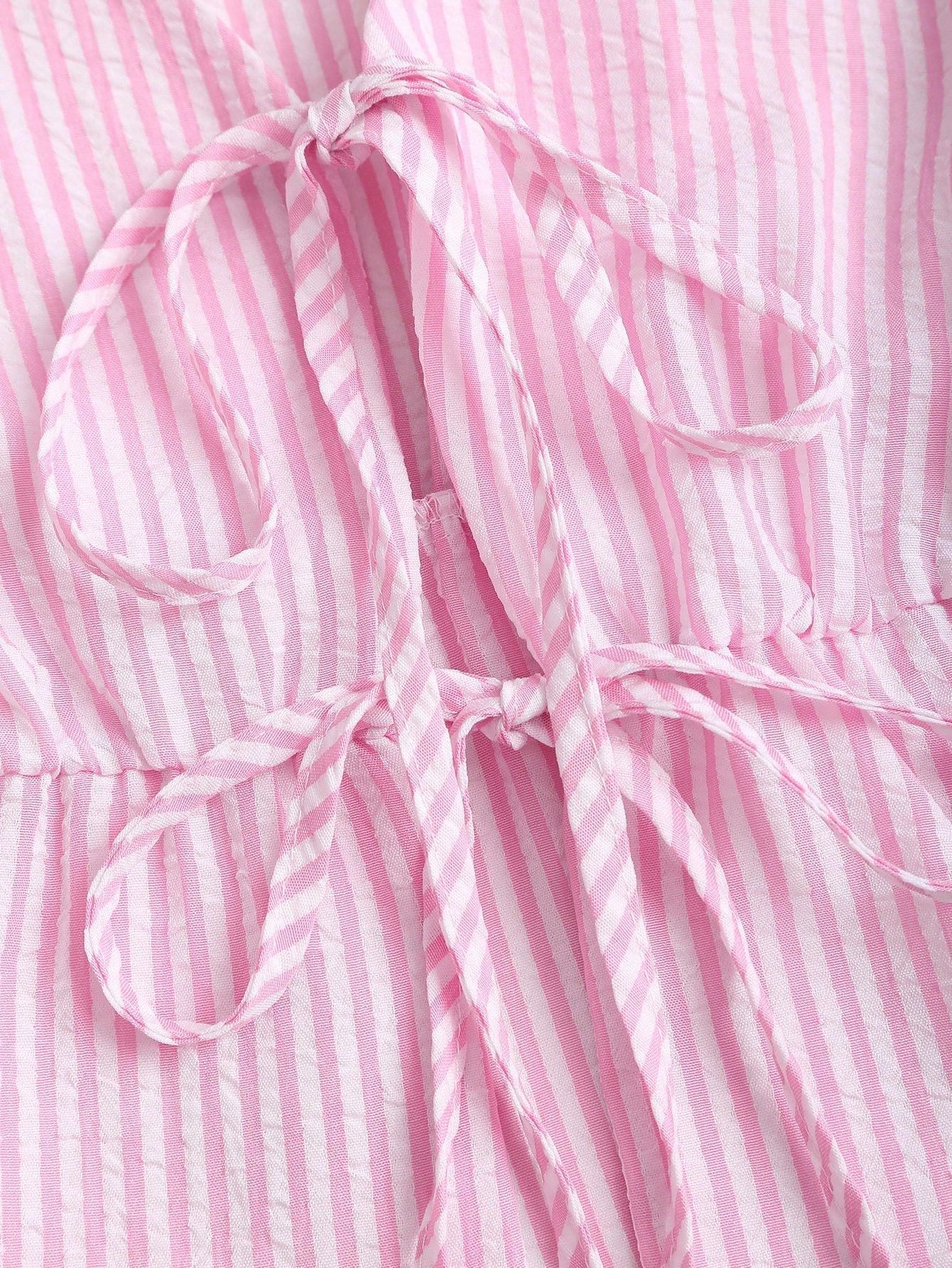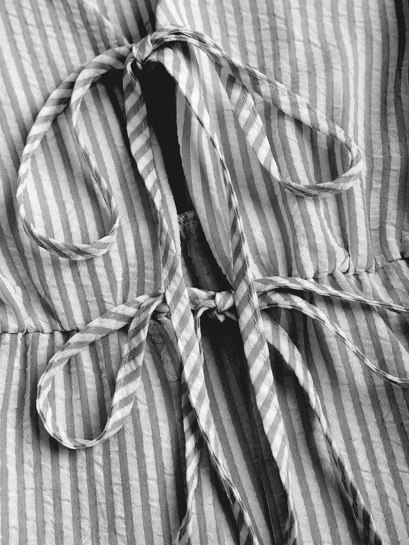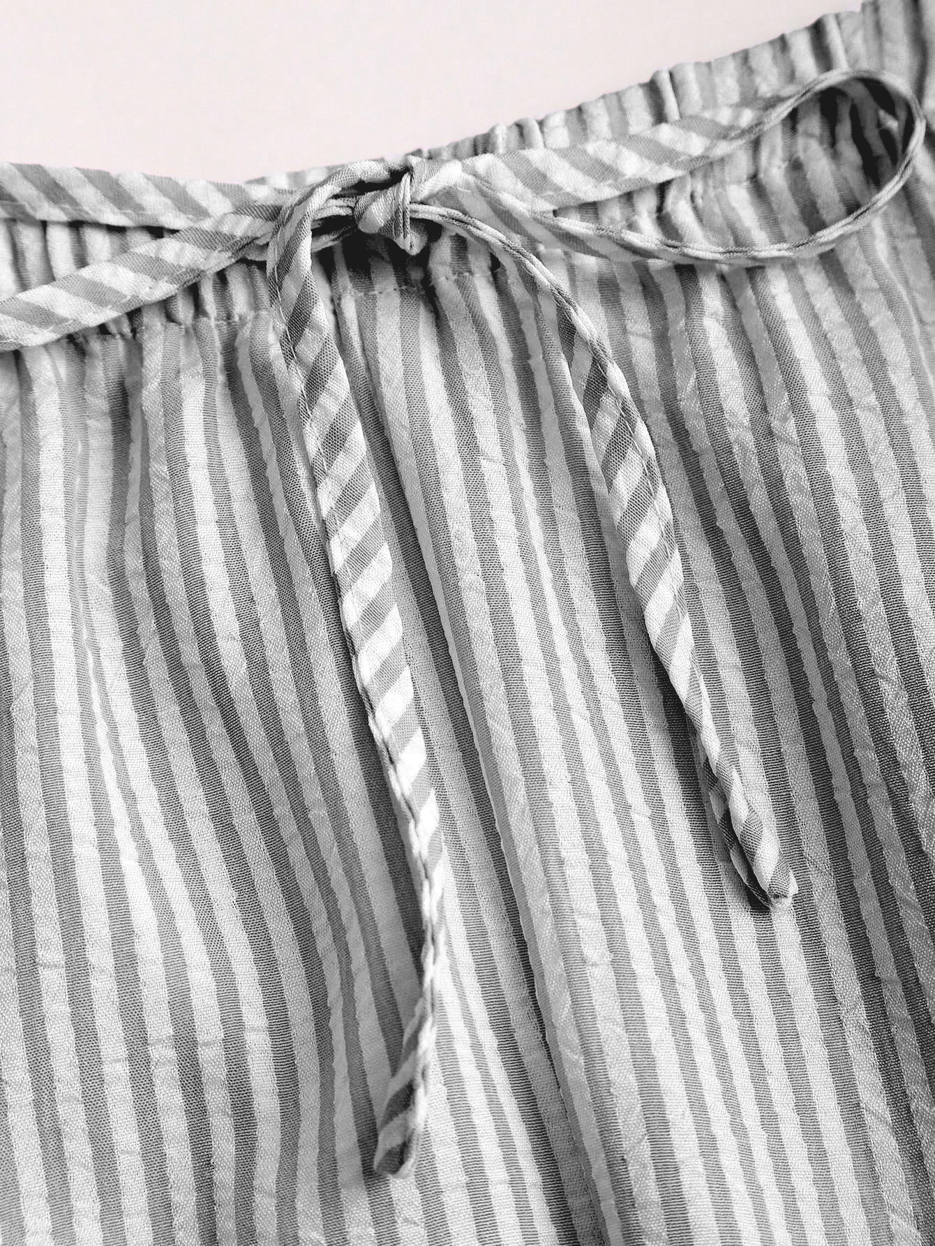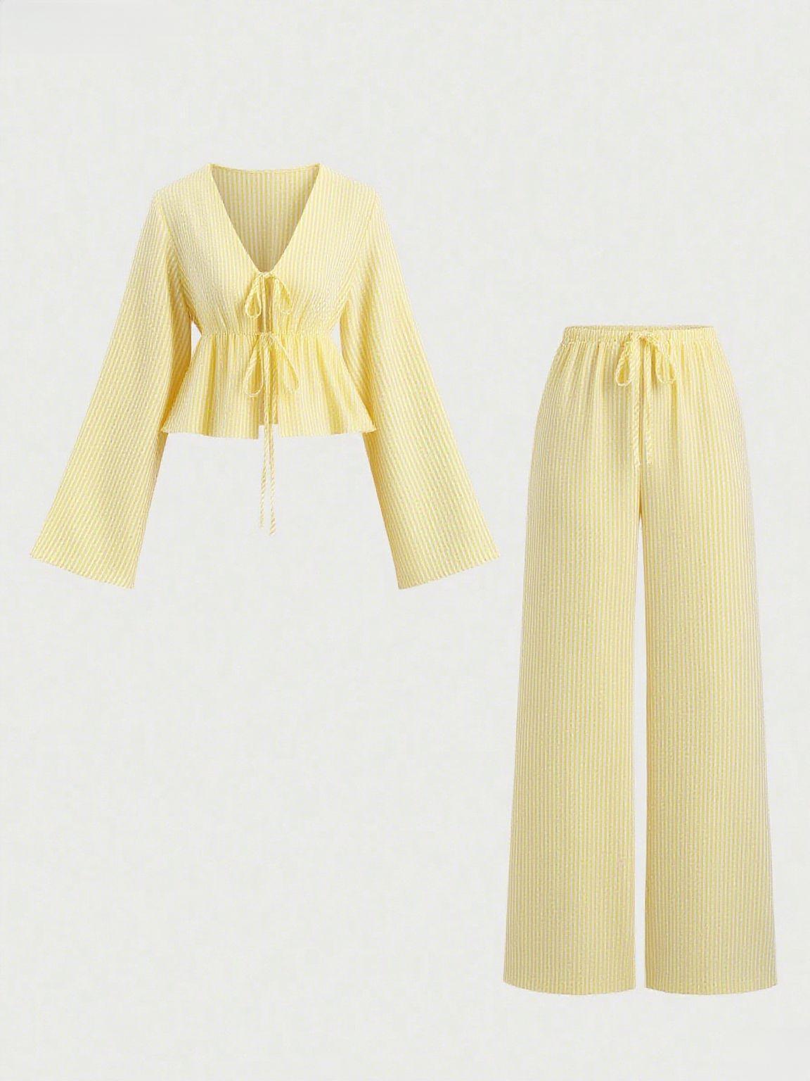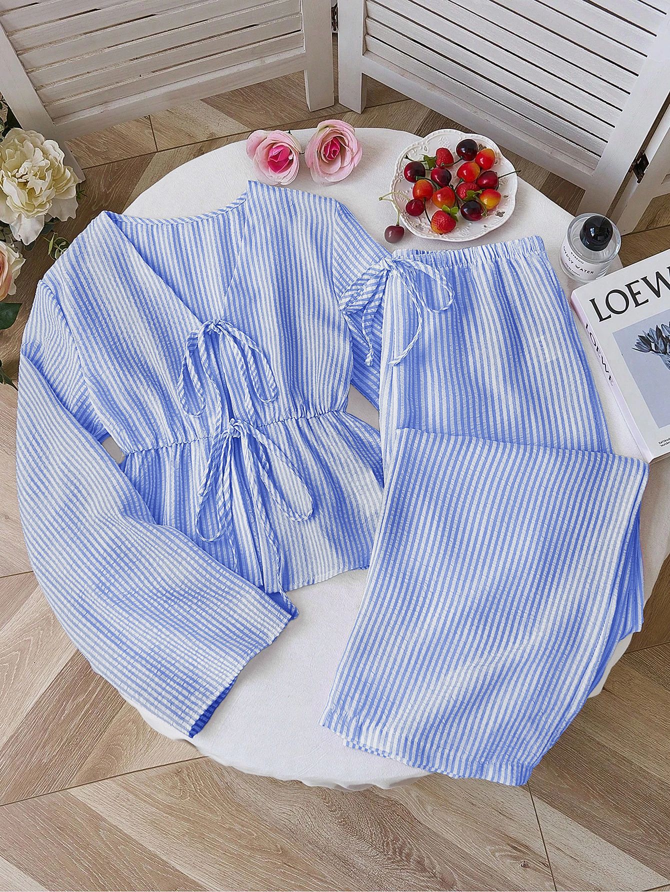 新款舒适高级感条纹宽松系带上衣休闲两件套百搭长袖甜美时尚套装