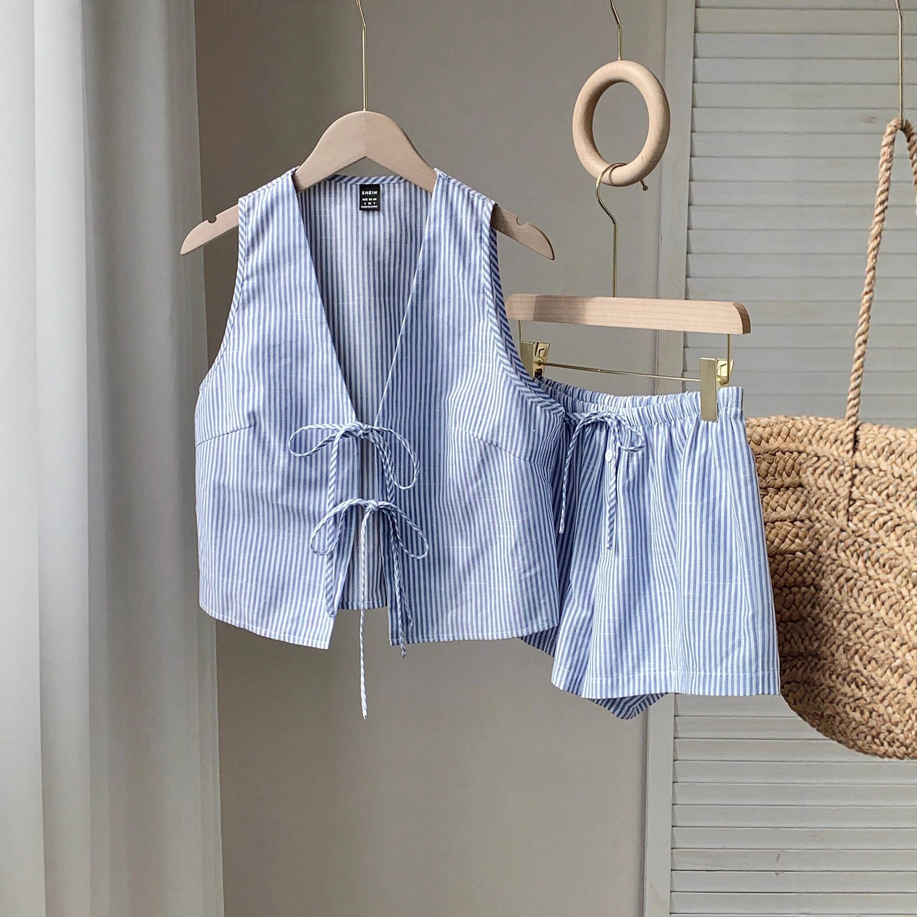 夏無地ストライプスーツカジュアルレースアップオールマッチベストルーズレースアップ無地パンツカジュアルスイートスーツ