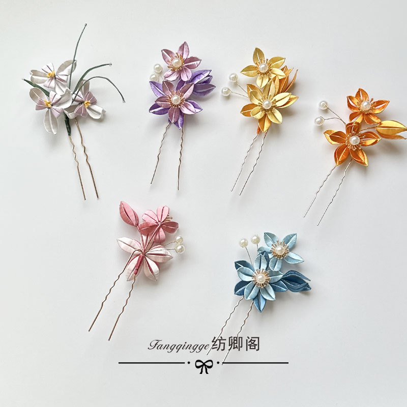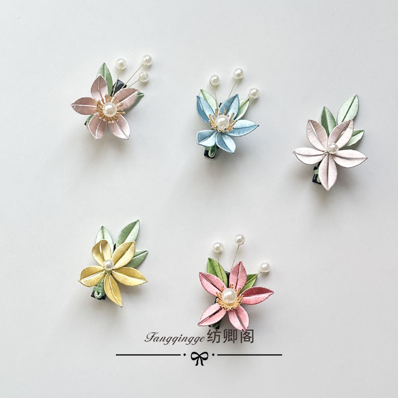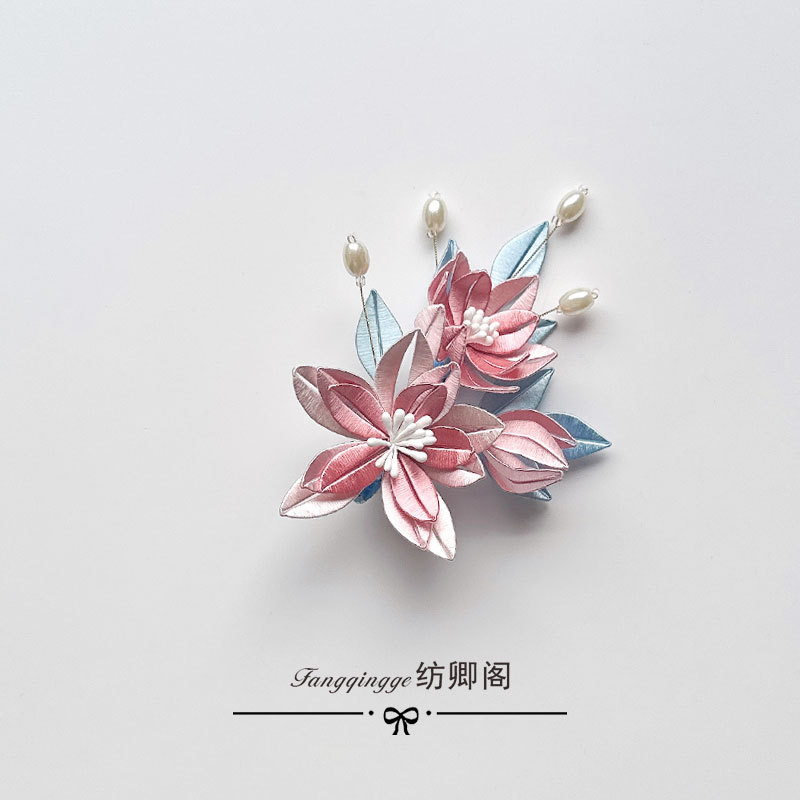 原创手工缠花超仙发夹粉蓝双色花朵珍珠款吸睛日常汉服发饰配饰
