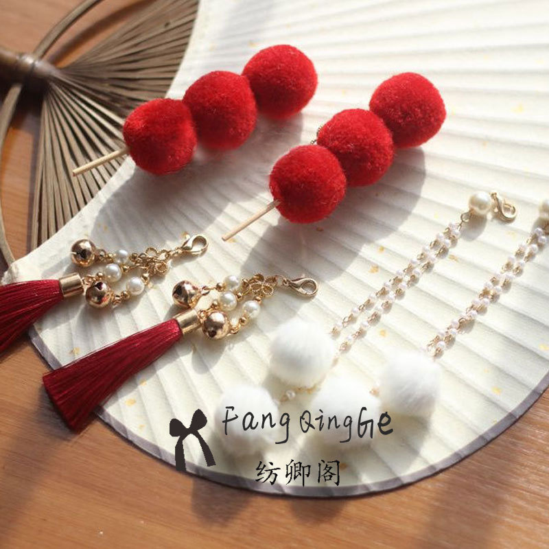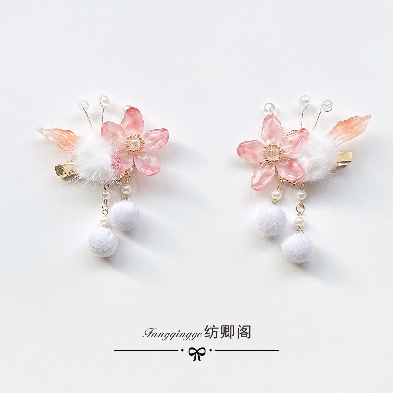 古风毛球花朵发夹汉服头饰可爱毛绒儿童流苏明宋制掩鬓边夹配饰