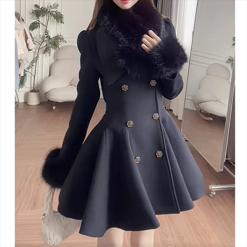 赫本序章小香风掐腰黑色毛领收腰毛呢大衣夹棉加厚毛呢子外套女冬