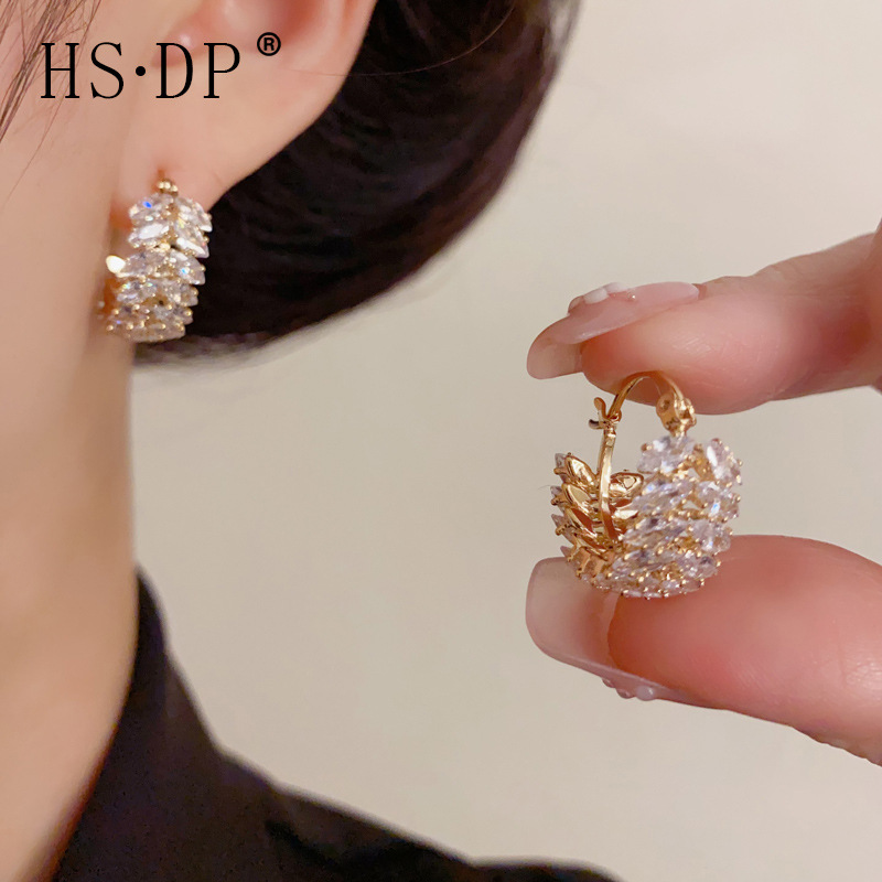 法式百搭高级感微镶锆石树叶圆圈耳扣女个性精致时尚超闪耳圈批发