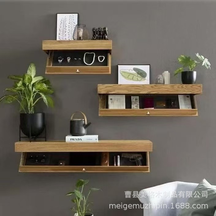 木製収納ラックリビングルーム壁掛け棚収納ボックス無垢材装飾ラックシンプルな隠し収納ボックス付き