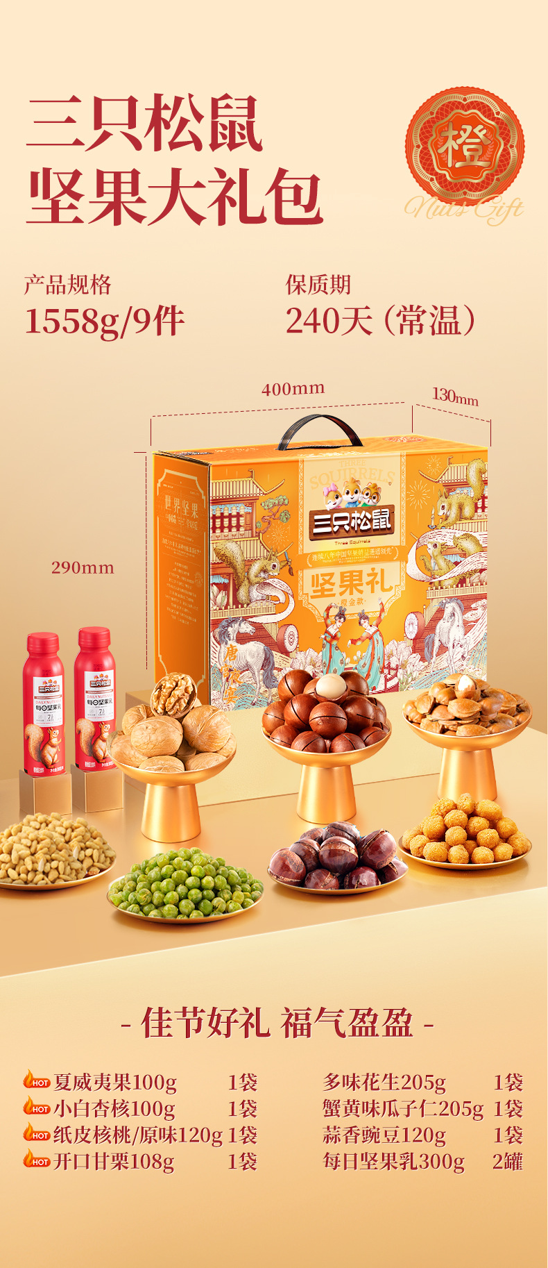 【三只松鼠_坚果礼/橙金款/1558g/9袋】新年礼盒零食品每日坚果礼