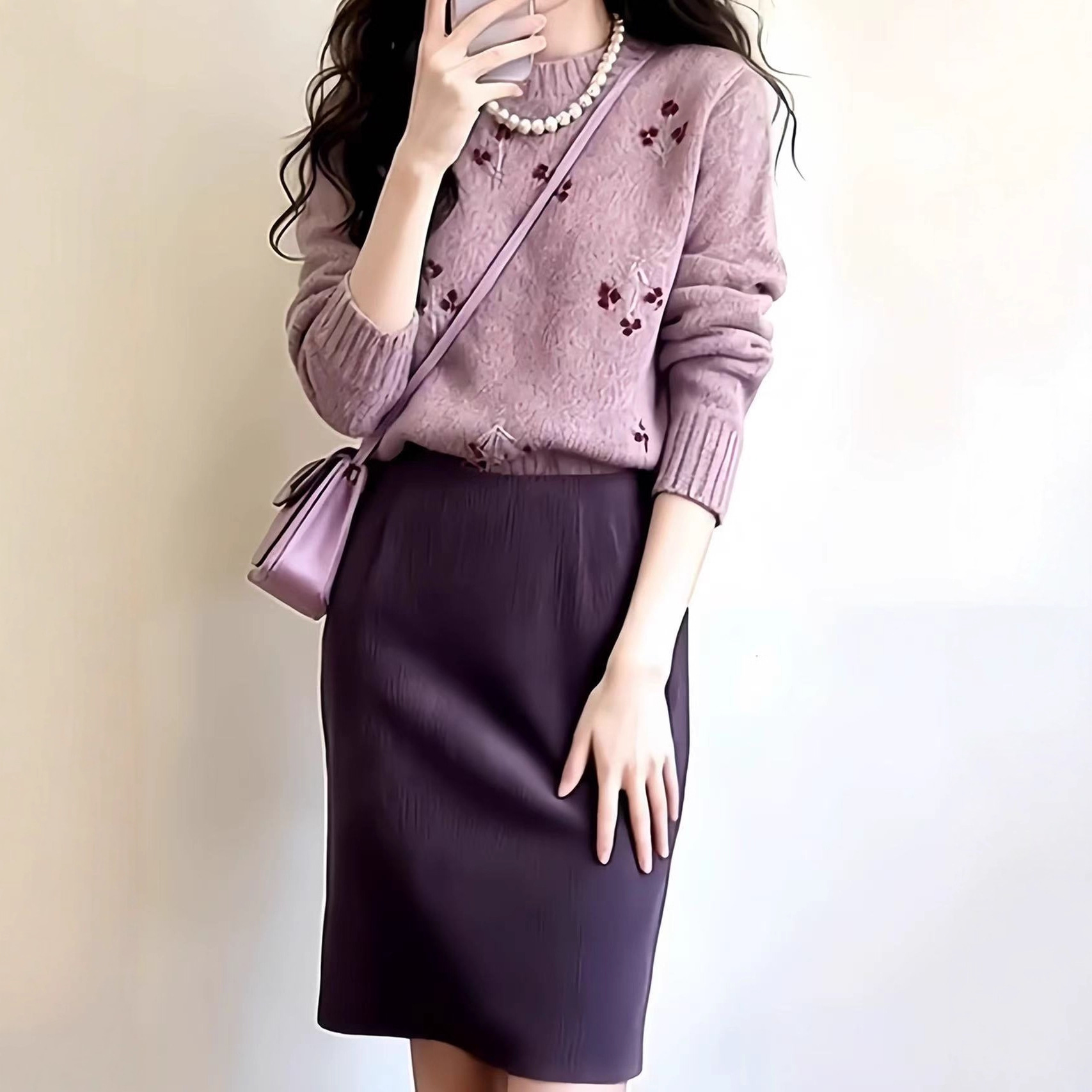 哥家商场同款女装2025冬季新款设计感刺绣圆领长袖小个子针织上衣