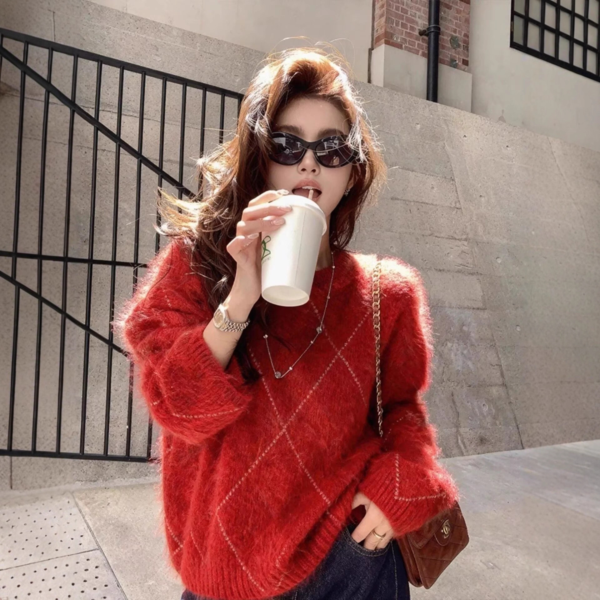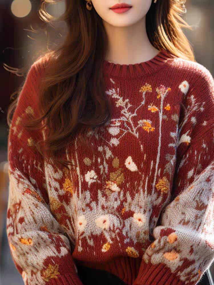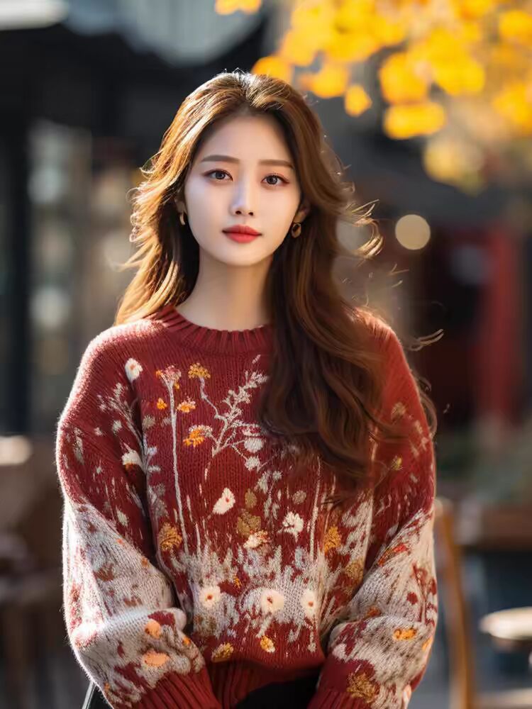 哥家专柜品质秋冬新款复古白马提花圆领红色针织衫宽松慵懒风毛衣