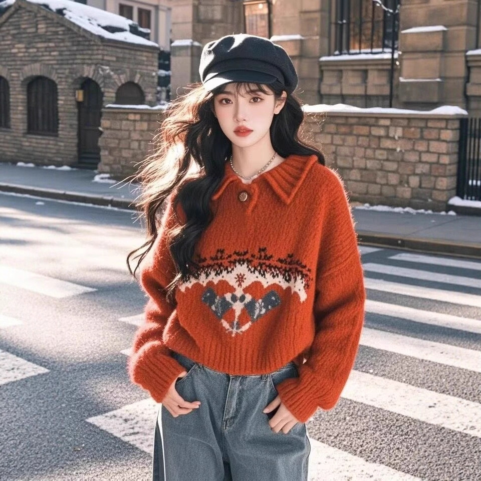 哥家专柜品质秋冬新款慵懒风毛衣圣诞氛围叠穿红色印花针织polo