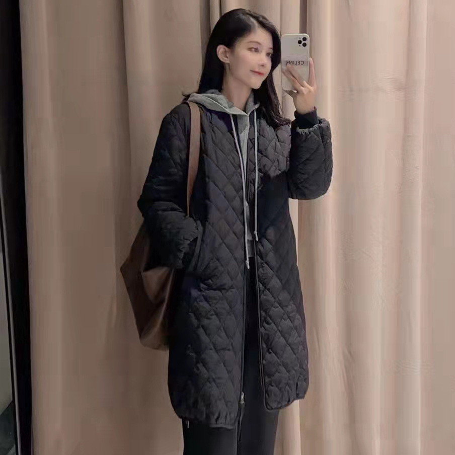 2025年秋冬新作、無地スタンドカラー、ゆったりとした菱形模様のミドル丈ダウンコットンジャケット、レディース