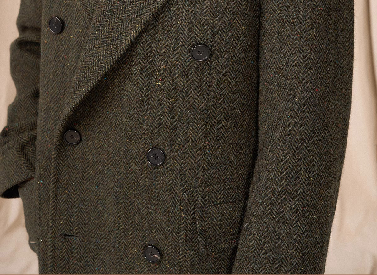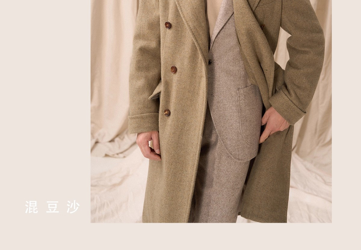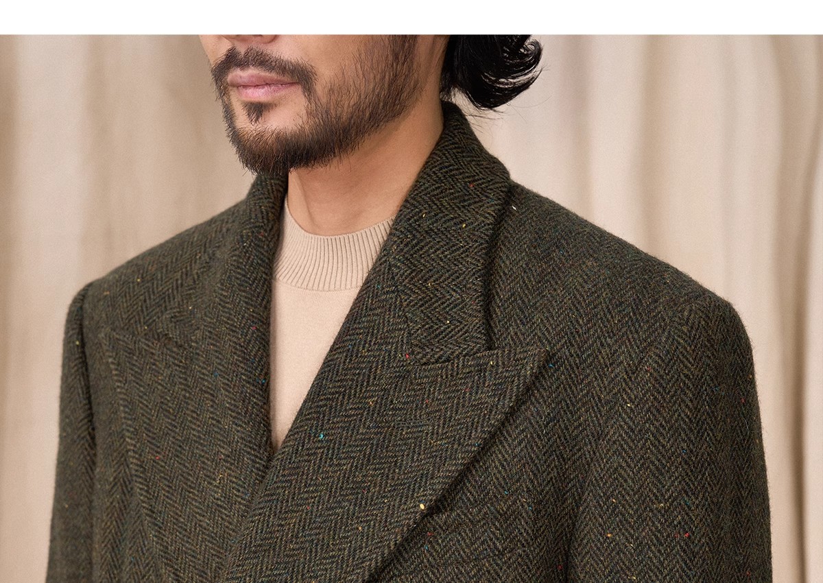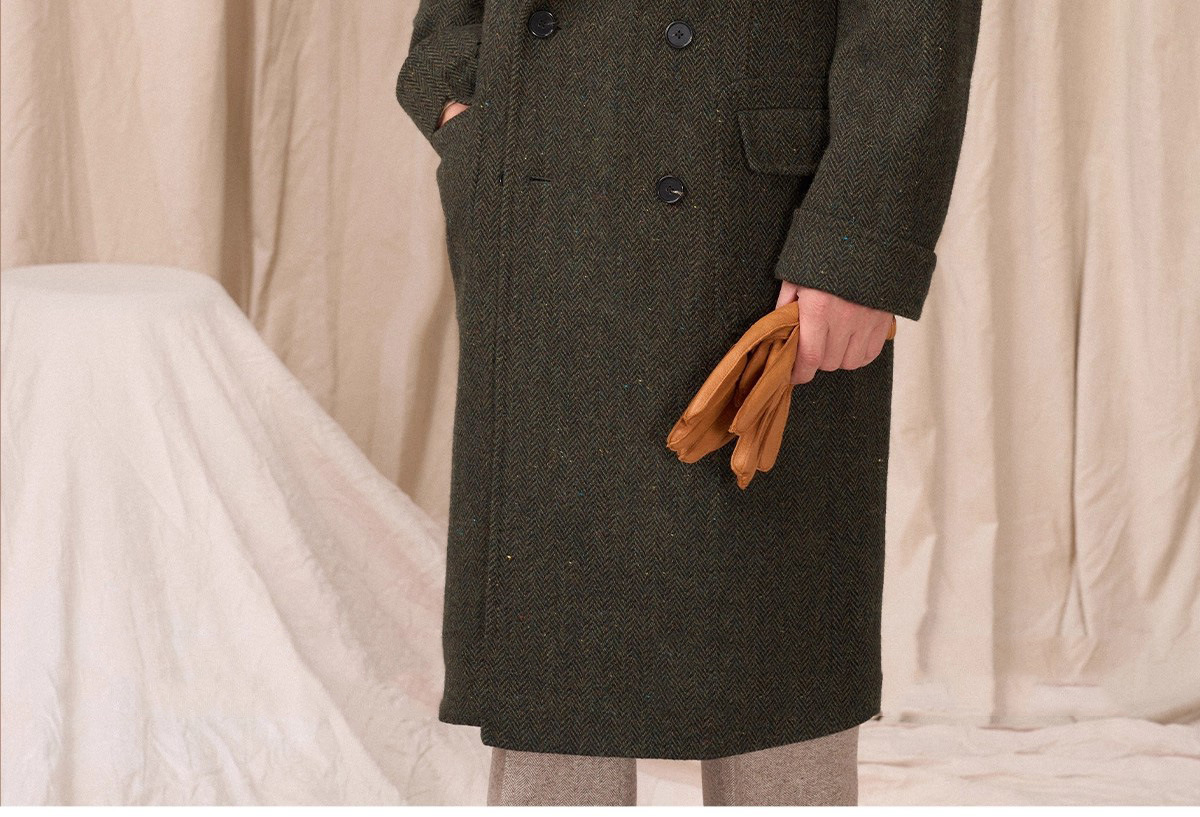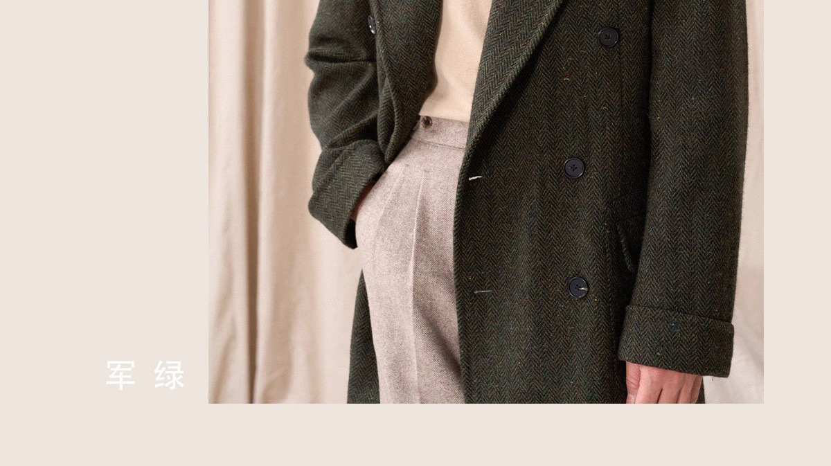 预售秋设计感冬羊毛大衣双排人字纹毛呢外套男