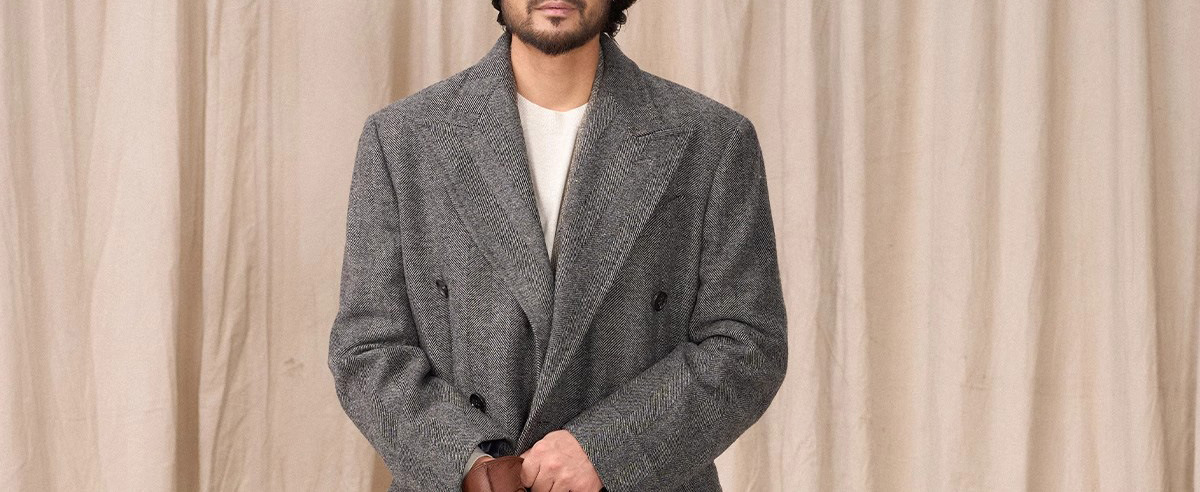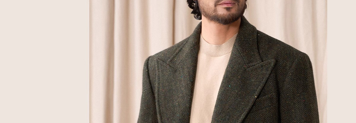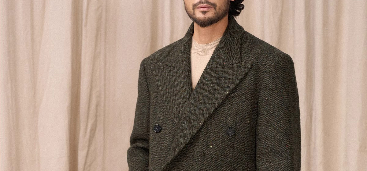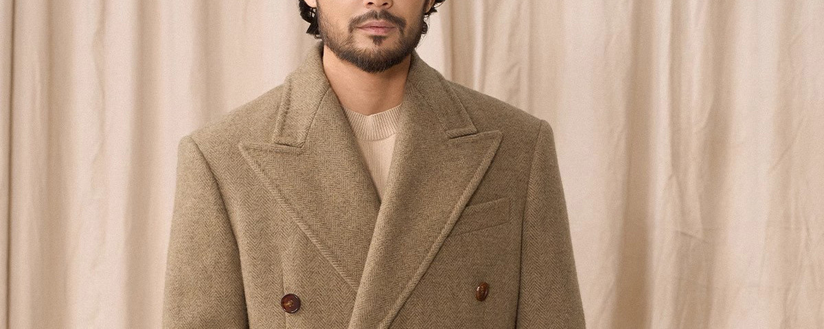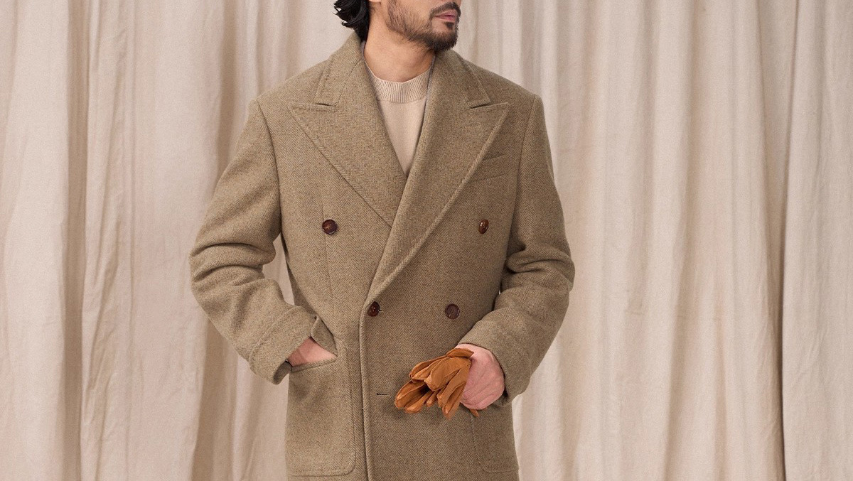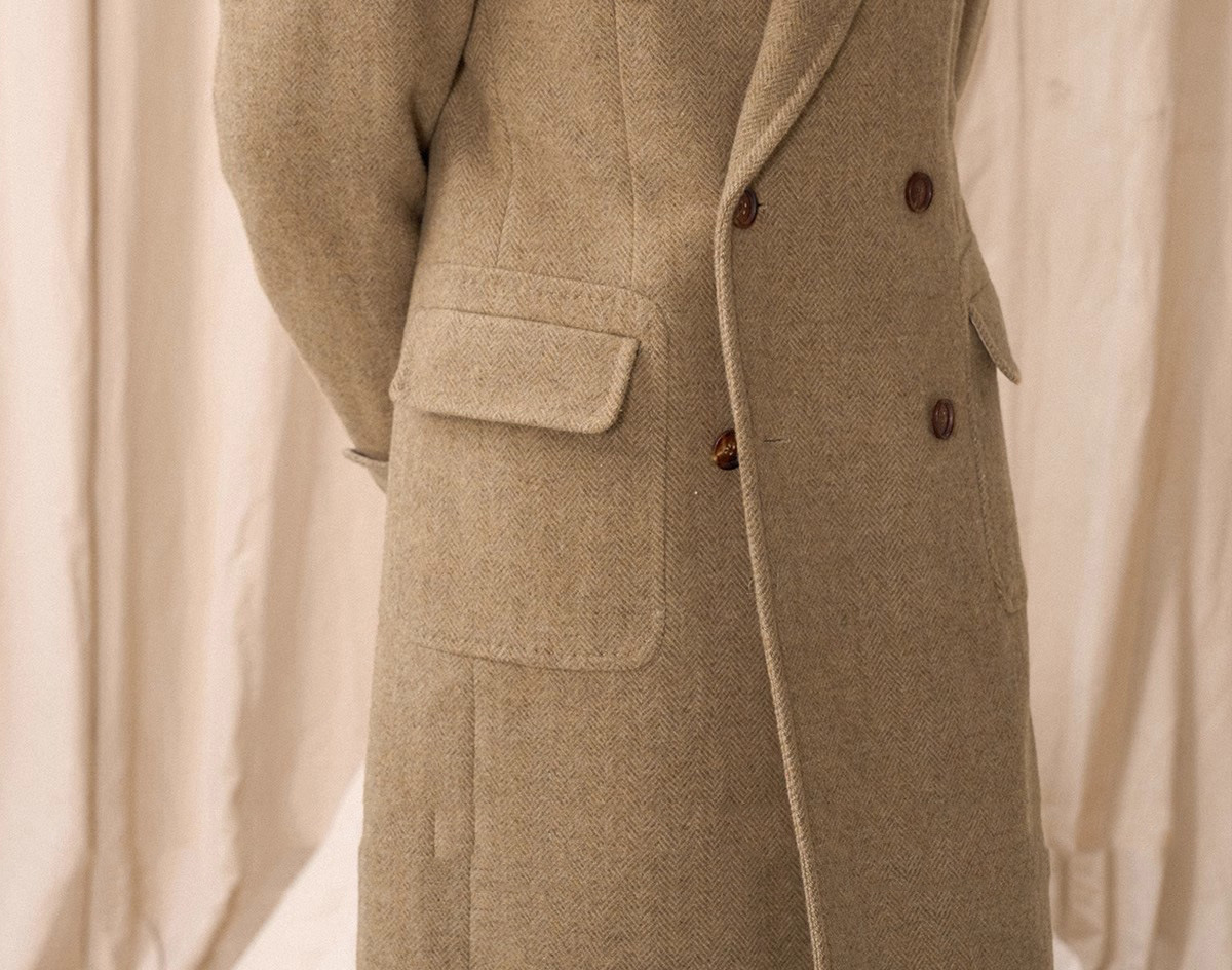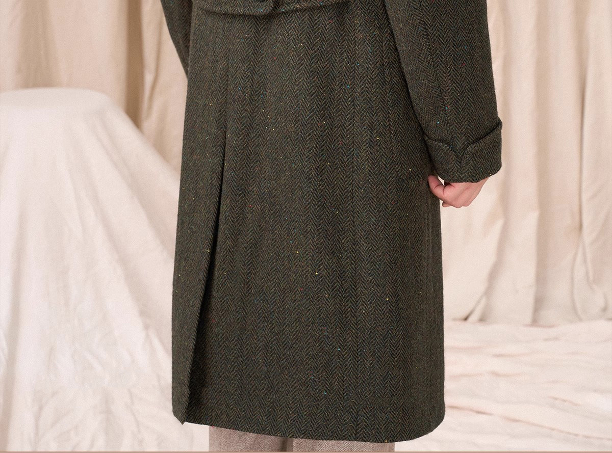 预售秋设计感冬羊毛大衣双排人字纹毛呢外套男