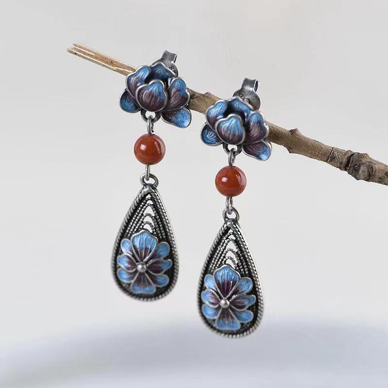 牡丹花烧蓝花丝耳钉S925银手工饰品民族风复古玉石耳环女耳坠