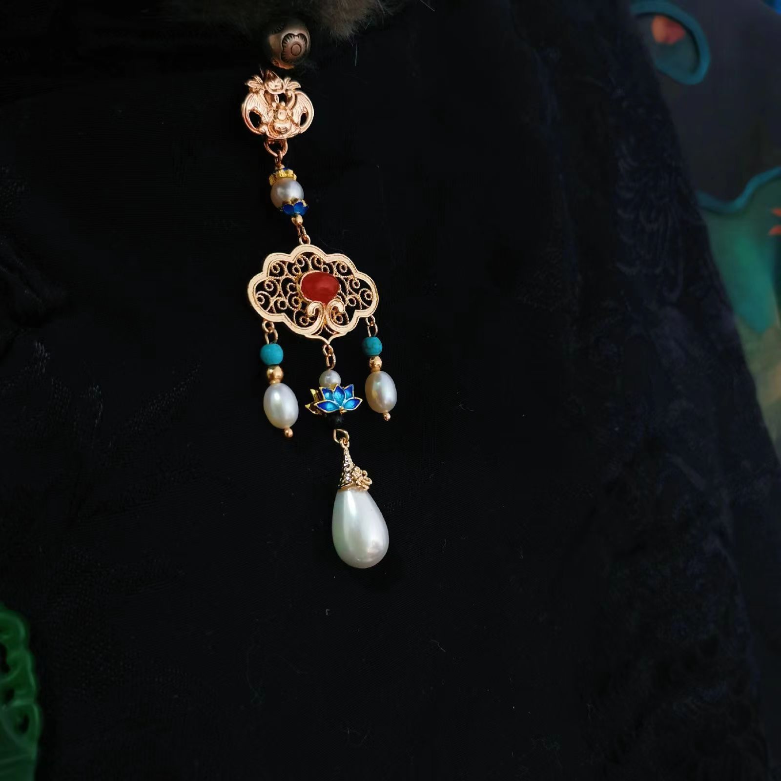 新中式|原创花丝锁压襟旗袍珍珠挂中国古风复古胸饰汉服挂件
