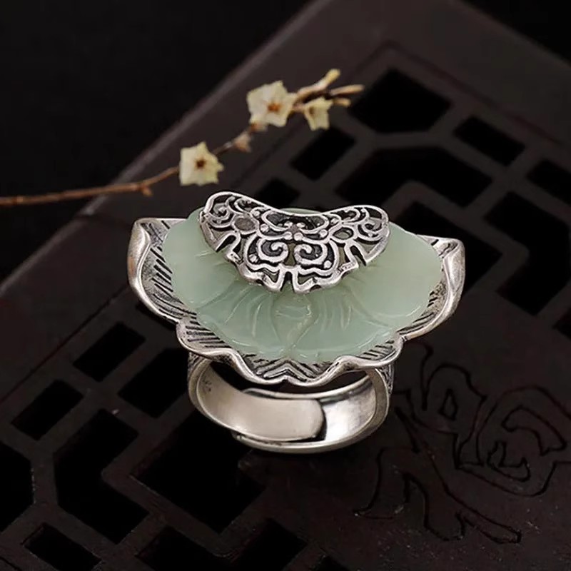 925银民族风复古做旧和田玉蝴蝶戒指女厚实质感夸张中式开口指环